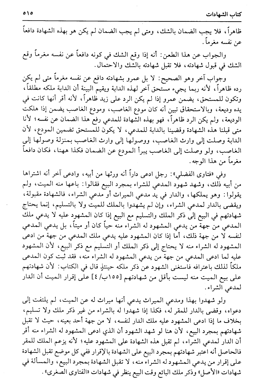 ولو شهدوا بهذا ومدعي الميراث يدعي أنها ميراث له عن الميت، لم يلتفت إلى دعواه، وقضى بالدار للمقر له، فكذا إذا شهدوا له بالشراء من غير ذكر ملك ولا تسليم، بخلاف ما إذا ادعى المشهود عليه ملك الدار لنفسه، لا من جهة أحد بعينه، حيث لا تقبل شهادتهم بمجرد البيع، لأن هنا لو شهد الشهود أن الذي ادعى المشهود له الشراء منه أقر أن الدار لمدعي الشراء، لم تقبل هذه الشهادة على المشهود عليه؛ لأنه يزعم الملك للمقر فالحاصل أنه اعتبر شهادتهم بمجرد البيع على الشهادة بالإقرار ففي كل موضع تقبل الشهادة على إقرار من يدعي المشهود له الشراء منه، لا تقبل الشهادة بمجرد البيع، والمسألة في شهادات «الأصل» وذكر ملك البائع وقت البيع ينظر في شهادات «الفتاوى الصغرى» .