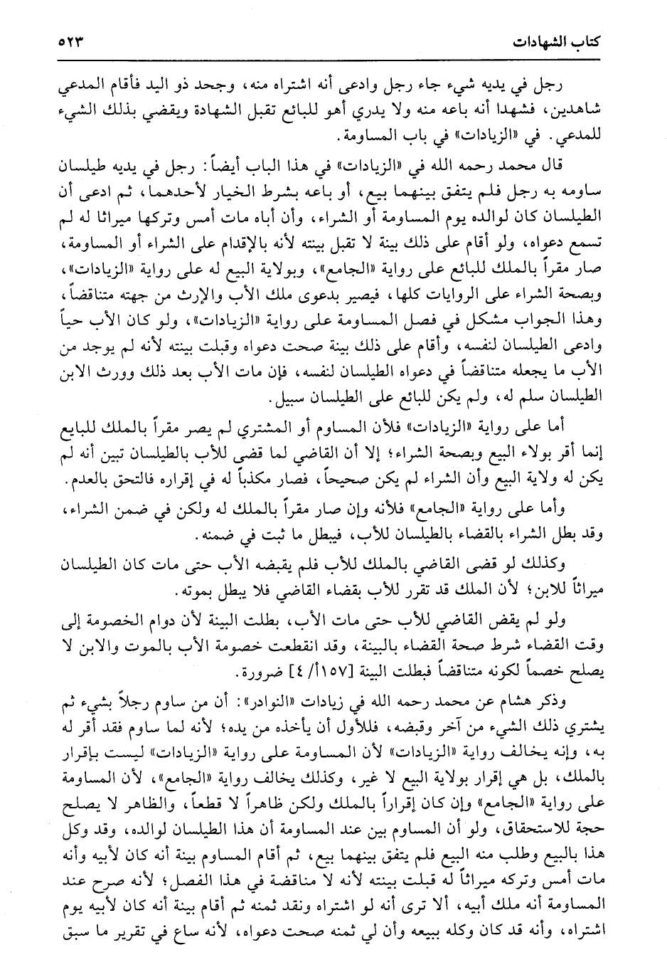 قال محمد رحمه الله في «الزيادات» في هذا الباب أيضاً: رجل في يديه طيلسان ساومه به رجل فلم يتفق بينهما بيع، أو باعه بشرط الخيار لأحدهما، ثم ادعى أن الطيلسان كان لوالده يوم المساومة أو الشراء، وأن أباه مات أمس وتركها ميراثا له لم تسمع دعواه، ولو أقام على ذلك بينة لا تقبل بينته لأنه بالإقدام على الشراء أو المساومة، صار مقراً بالملك للبائع على رواية «الجامع» ، وبولاية البيع له على رواية «الزيادات» ، وبصحة الشراء على الروايات كلها، فيصير بدعوى ملك الأب والإرث من جهته متناقضاً، وهذا الجواب مشكل في فصل المساومة على رواية «الزيادات» ، ولو كان الأب حياً وادعى الطيلسان لنفسه، وأقام على ذلك بينة صحت دعواه وقبلت بينته لأنه لم يوجد من الأب ما يجعله متناقضاً في دعواه الطيلسان لنفسه، فإن مات الأب بعد ذلك وورث الابن الطيلسان سلم له، ولم يكن للبائع على الطيلسان سبيل.
