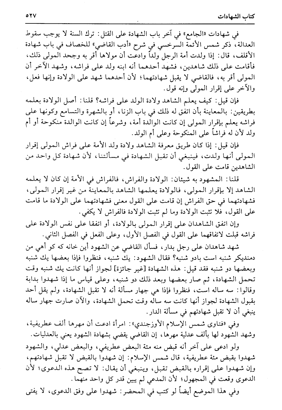 في شهادات «الجامع» في آخر باب الشهادة على القتل: ترك السنة لا يوجب سقوط العدالة، ذكر شمس الأئمة السرخسي في شرح «أدب القاضي» للخصاف في باب شهادة الأقلف، قال: إذا ولدت أمة الرجل ولداً وادعت أن مولاها أقر به وجحد المولى ذلك، فأقامت على ذلك شاهدين، فشهد أحدهما أنه ابنه ولد على فراشه، وشهد الآخر أن المولى أقر به، فالقاضي لا يقبل شهادتهما؛ لأن أحدهما شهد على الولادة وإنها فعل، والآخر على إقرار المولى وإنه قول.