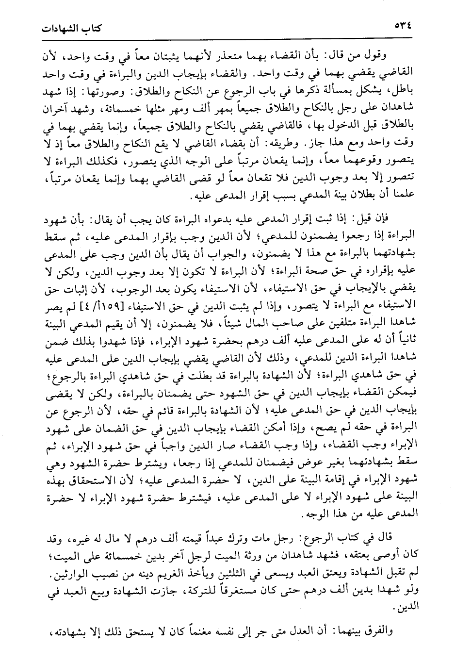 وقول من قال: بأن القضاء بهما متعذر لأنهما يثبتان معاً في وقت واحد، لأن القاضي يقضي بهما في وقت واحد. والقضاء بإيجاب الدين والبراءة في وقت واحد باطل، يشكل بمسألة ذكرها في باب الرجوع عن النكاح والطلاق: وصورتها: إذا شهد شاهدان على رجل بالنكاح والطلاق جميعاً بمهر ألف ومهر مثلها خمسمئة، وشهد آخران بالطلاق قبل الدخول بها، فالقاضي يقضي بالنكاح والطلاق جميعاً، وإنما يقضي بهما في وقت واحد ومع هذا جاز.