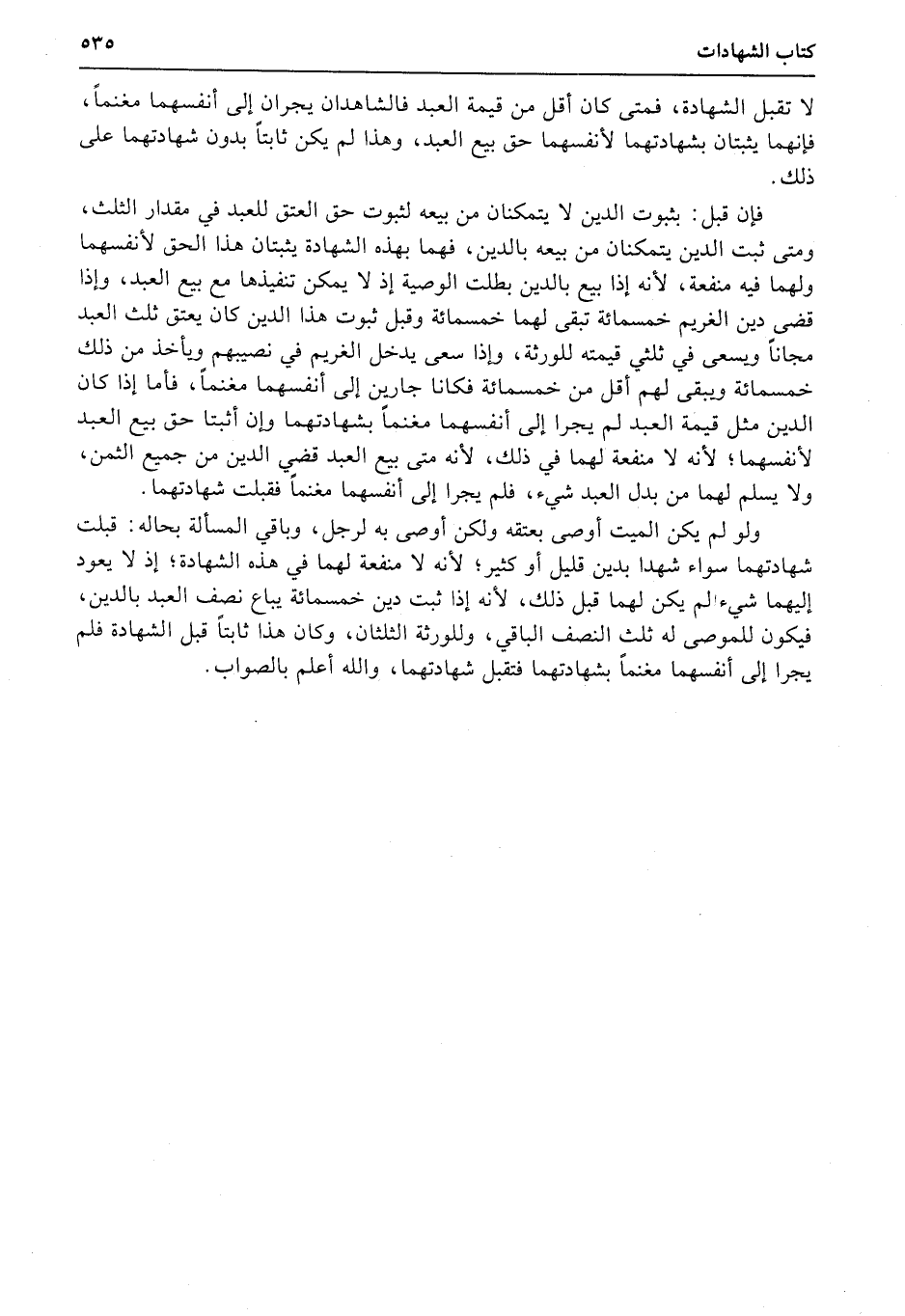 فإن قبل: بثبوت الدين لا يتمكنان من بيعه لثبوت حق العتق للعبد في مقدار الثلث، ومتى ثبت الدين يتمكنان من بيعه بالدين، فهما بهذه الشهادة يثبتان هذا الحق لأنفسهما ولهما فيه منفعة، لأنه إذا بيع بالدين بطلت الوصية إذ لا يمكن تنفيذها مع بيع العبد، وإذا قضى دين الغريم خمسمئة تبقى لهما خمسمئة وقبل ثبوت هذا الدين كان يعتق ثلث العبد مجاناً ويسعى في ثلثي قيمته للورثة، وإذا سعى يدخل الغريم في نصيبهم ويأخذ من ذلك خمسمئة ويبقى لهم أقل من خمسمئة فكانا جارين إلى أنفسهما مغنماً، فأما إذا كان الدين مثل قيمة العبد لم يجرا إلى أنفسهما مغنماً بشهادتهما وإن أثبتا حق بيع العبد لأنفسهما؛ لأنه لا منفعة لهما في ذلك، لأنه متى بيع العبد قضي الدين من جميع الثمن، ولا يسلم لهما من بدل العبد شيء، فلم يجرا إلى أنفسهما مغنماً فقبلت شهادتهما.