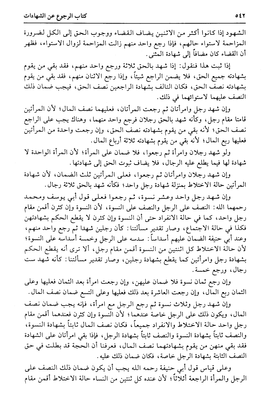 الشهود إذا كانوا أكثر من الاثنين يضاف القضاء ووجوب الحق إلى الكل لضرورة المزاحمة لاستواء حالهم، فإذا رجع واحد منهم زالت المزاحمة لزوال الاستواء، فظهر أن القضاء كان مضافاً إلى شهادة المثنى.