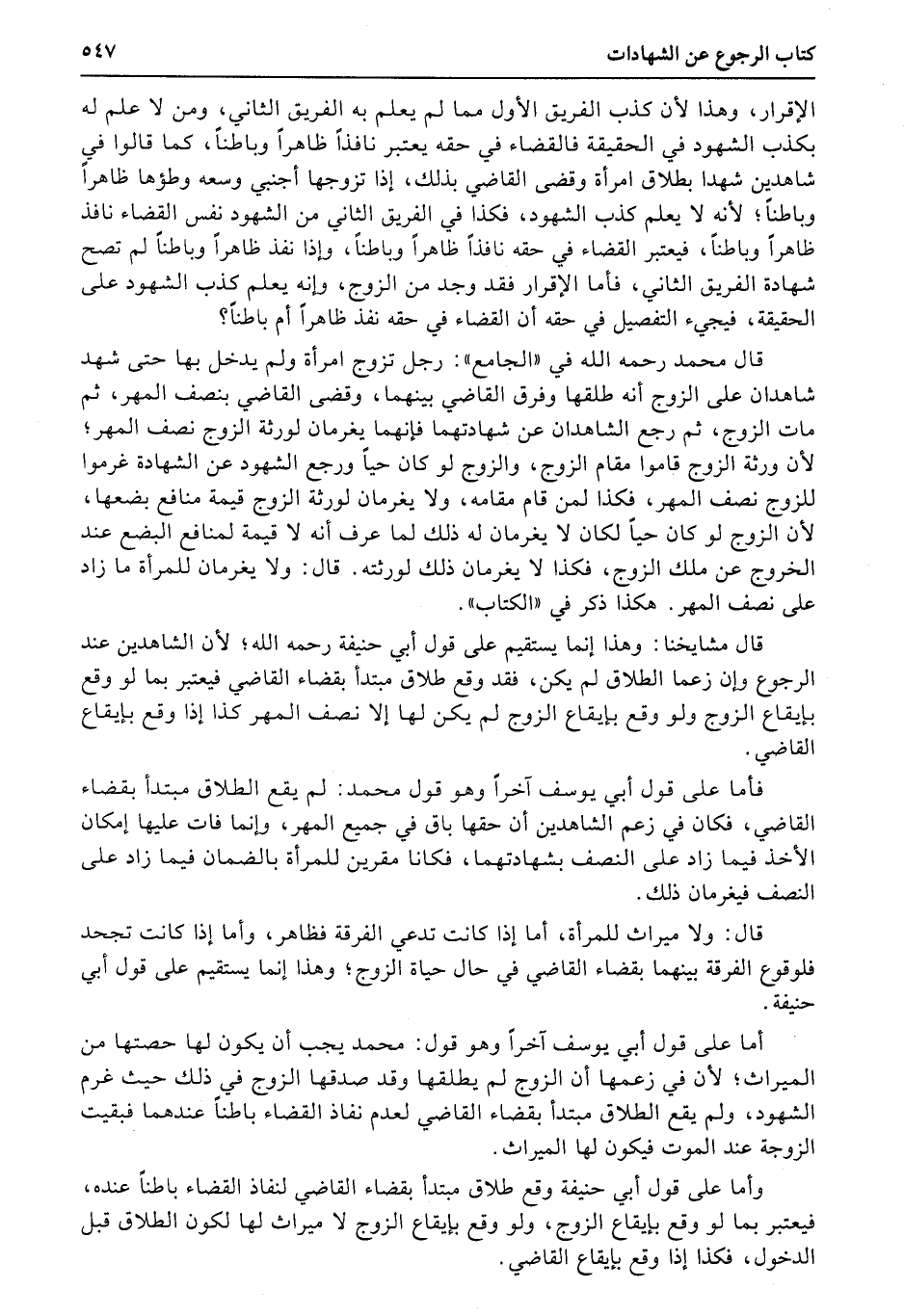 أما على قول أبي يوسف آخراً وهو قول: محمد يجب أن يكون لها حصتها من الميراث؛ لأن في زعمها أن الزوج لم يطلقها وقد صدقها الزوج في ذلك حيث غرم الشهود، ولم يقع الطلاق مبتدأ بقضاء القاضي لعدم نفاذ القضاء باطناً عندهما فبقيت الزوجة عند الموت فيكون لها الميراث.