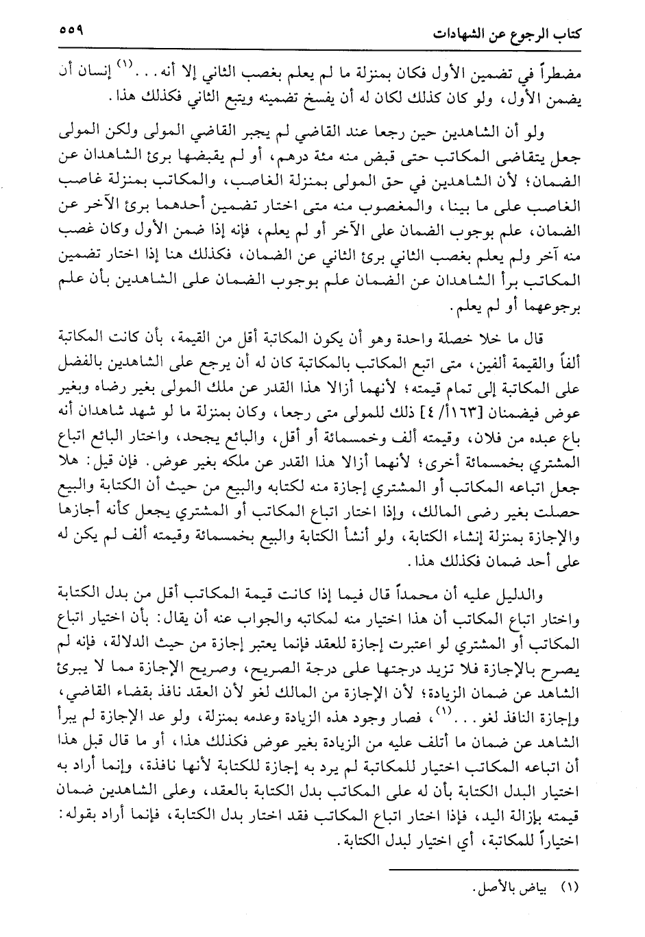 والدليل عليه أن محمداً قال: فيما إذا كانت قيمة المكاتب أقل من بدل الكتابة واختار اتباع المكاتب أن هذا اختيار منه لمكاتبه والجواب عنه أن يقال: بأن اختيار اتباع المكاتب أو المشتري لو اعتبرت إجازة للعقد فإنما يعتبر إجازة من حيث الدلالة، فإنه لم يصرح بالإجازة فلا تزيد درجتها على درجة الصريح، وصريح الإجازة مما لا يبرئ الشاهد عن ضمان الزيادة؛ لأن الإجازة من المالك لغو لأن العقد نافذ بقضاء القاضي، وإجازة النافذ لغو ... ، فصار وجود هذه الزيادة وعدمه بمنزلة، ولو عد الإجازة لم يبرأ الشاهد عن ضمان ما أتلف عليه من الزيادة بغير عوض فكذلك هذا، أو ما قال قبل هذا أن اتباعه المكاتب اختيار للمكاتبة لم يرد به إجازة للكتابة لأنها نافذة، وإنما أراد به اختيار البدل الكتابة بأن له على المكاتب بدل الكتابة بالعقد، وعلى الشاهدين ضمان قيمته بإزالة اليد، فإذا اختار اتباع المكاتب فقد اختار بدل الكتابة، فإنما أراد بقوله: اختياراً للمكاتبة، أي اختيار لبدل الكتابة.