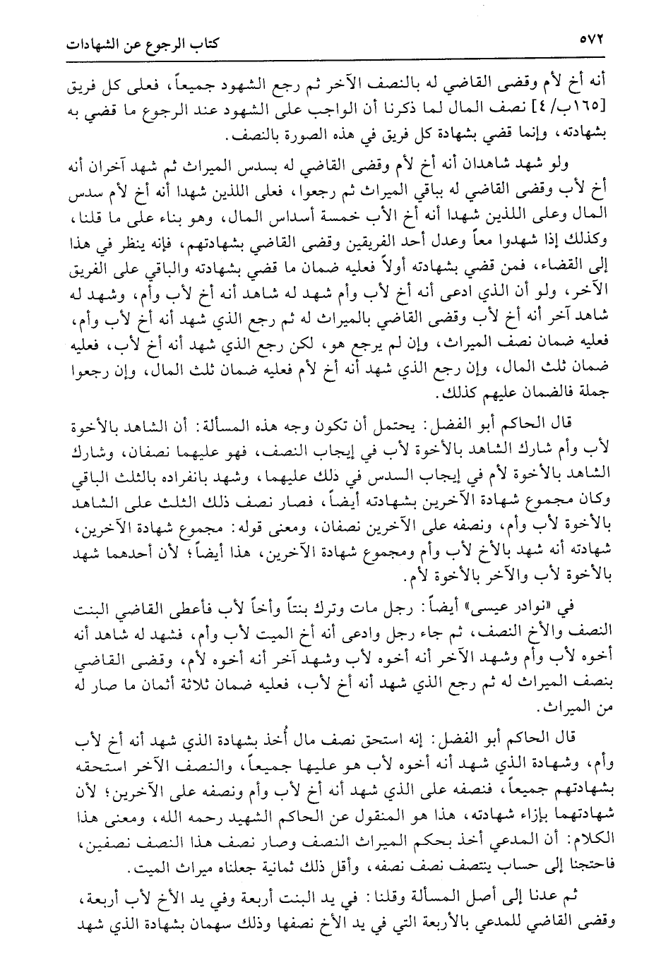 في «نوادر عيسى» أيضاً: رجل مات وترك بنتاً وأخاً لأب فأعطى القاضي البنت النصف والأخ النصف، ثم جاء رجل وادعى أنه أخ الميت لأب وأم، فشهد له شاهد أنه أخوه لأب وأم وشهد الآخر أنه أخوه لأب وشهد آخر أنه أخوه لأم، وقضى القاضي بنصف الميراث له ثم رجع الذي شهد أنه أخ لأب، فعليه ضمان ثلاثة أثمان ما صار له من الميراث.