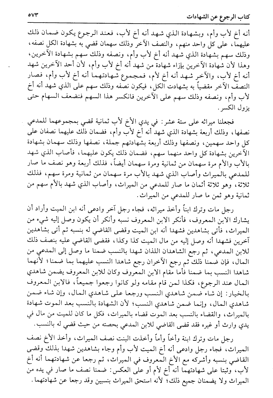أنه أخ لأب وأم، وبشهادة الذي شهد أنه أخ لأب، فعند الرجوع يكون ضمان ذلك عليهما، على كل واحد منهم، والنصف الآخر وذلك سهمان قضي به بشهادة الكل نصفه، وذلك سهم بشهادة الذي شهد أنه أخ لأب وأم، ونصفه وذلك سهم بشهادة الآخرين، وهذا لأن شهادة الآخرين بإزاء شهادة من شهد أنه أخ لأب وأم، لأن أحد الآخرين شهد أنه أخ لأب، والآخر شهد أنه أخ لأم، فمجموع شهادتهما أنه أخ لأب وأم، فصار النصف الآخر مقضياً به بشهادت الكل، فيكون نصفه وذلك سهم على الذي شهد أنه أخ لأب وأم، ونصفه وذلك سهم على الآخرين فانكسر هذا السهم فنضعف السهام حتى يزول الكسر.