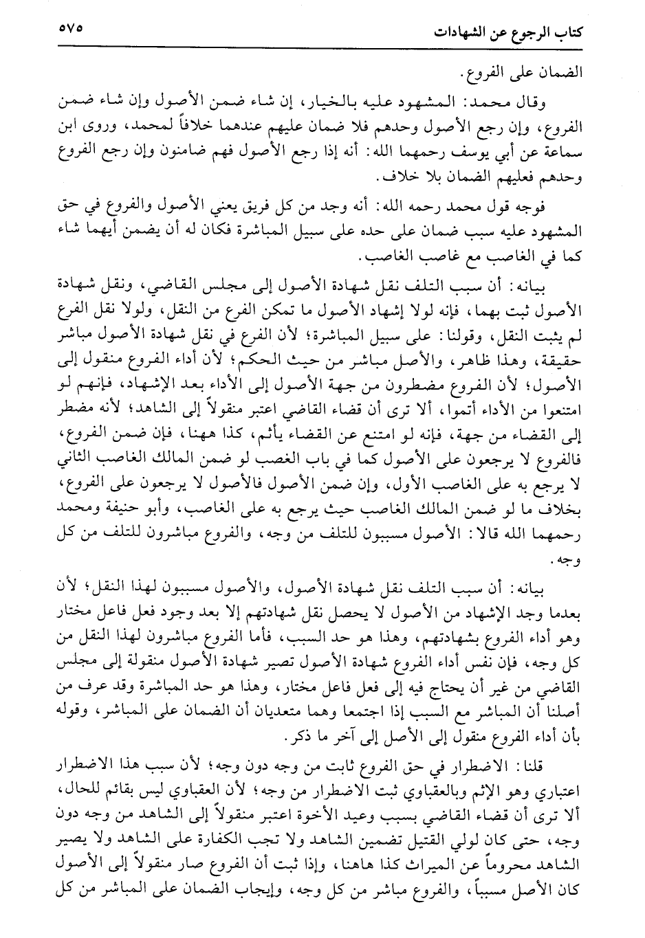 بيانه: أن سبب التلف نقل شهادة الأصول إلى مجلس القاضي، ونقل شهادة الأصول ثبت بهما، فإنه لولا إشهاد الأصول ما تمكن الفرع من النقل، ولولا نقل الفرع لم يثبت النقل، وقولنا: على سبيل المباشرة؛ لأن الفرع في نقل شهادة الأصول مباشر حقيقة، وهذا ظاهر، والأصل مباشر من حيث الحكم؛ لأن أداء الفروع منقول إلى الأصول؛ لأن الفروع مضطرون من جهة الأصول إلى الأداء بعد الإشهاد، فإنهم لو امتنعوا من الأداء أتموا، ألا ترى أن قضاء القاضي اعتبر منقولاً إلى الشاهد؛ لأنه مضطر إلى القضاء من جهة، فإنه لو امتنع عن القضاء يأثم، كذا ههنا، فإن ضمن الفروع، فالفروع لا يرجعون على الأصول كما في باب الغصب لو ضمن المالك الغاصب الثاني لا يرجع به على الغاصب الأول، وإن ضمن الأصول فالأصول لا يرجعون على الفروع، بخلاف ما لو ضمن المالك الغاصب حيث يرجع به على الغاصب، وأبو حنيفة ومحمد رحمهما الله قالا: الأصول مسببون للتلف من وجه، والفروع مباشرون للتلف من كل وجه.