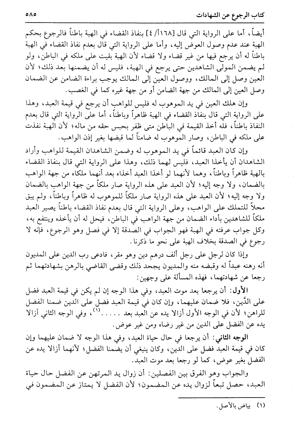 أيضاً، أما على الرواية التي قال (168أ4) بنفاذ القضاء في الهبة باطناً فالرجوع بحكم الهبة عند عدم وصول العوض إليه، وأما على الرواية التي قال بعدم نفاذ القضاء في الهبة باطناً له أن يرجع فيها من غير قضاء ولا قضاء لأن الهبة بقيت على ملكه في الباطن، ولو لم يضمن المولى الشاهدين حتى يرجع في الهبة، فليس له أن يضمنها بعد ذلك؛ لأن العين وصل إلى المالك، ووصول العين إلى المالك يوجب براءة الضامن عن الضمان وصل العين إلى المالك من جهة الضامن أو من جهة غيره كما في الغصب.