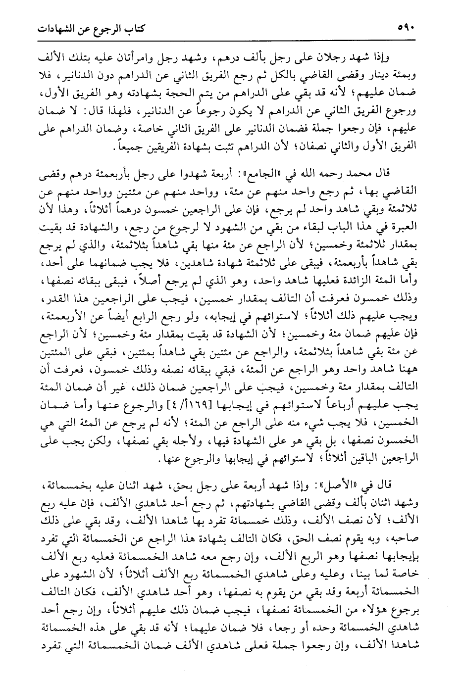وإذا شهد رجلان على رجل بألف درهم، وشهد رجل وامرأتان عليه بتلك الألف وبمئة دينار وقضى القاضي بالكل ثم رجع الفريق الثاني عن الدراهم دون الدنانير، فلا ضمان عليهم؛ لأنه قد بقي على الدراهم من يتم الحجة بشهادته وهو الفريق الأول، ورجوع الفريق الثاني عن الدراهم لا يكون رجوعاً عن الدنانير، فلهذا قال: لا ضمان عليهم، فإن رجعوا جملة فضمان الدنانير على الفريق الثاني خاصة، وضمان الدراهم على الفريق الأول والثاني نصفان؛ لأن الدراهم تثبت بشهادة الفريقين جميعاً.