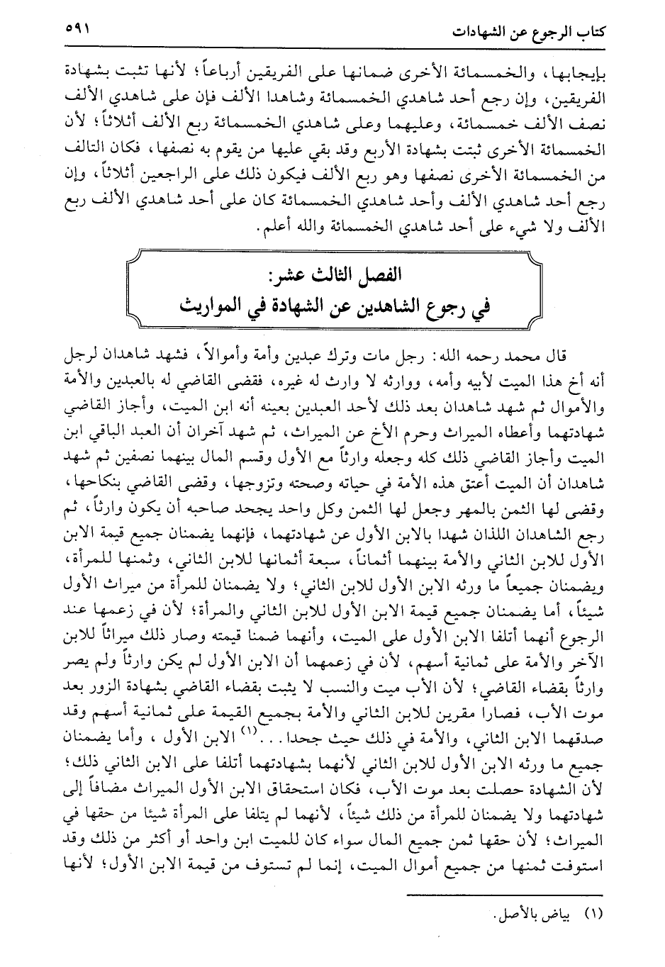 الفصل الثالث عشر: في رجوع الشاهدين عن الشهادة في المواريث
