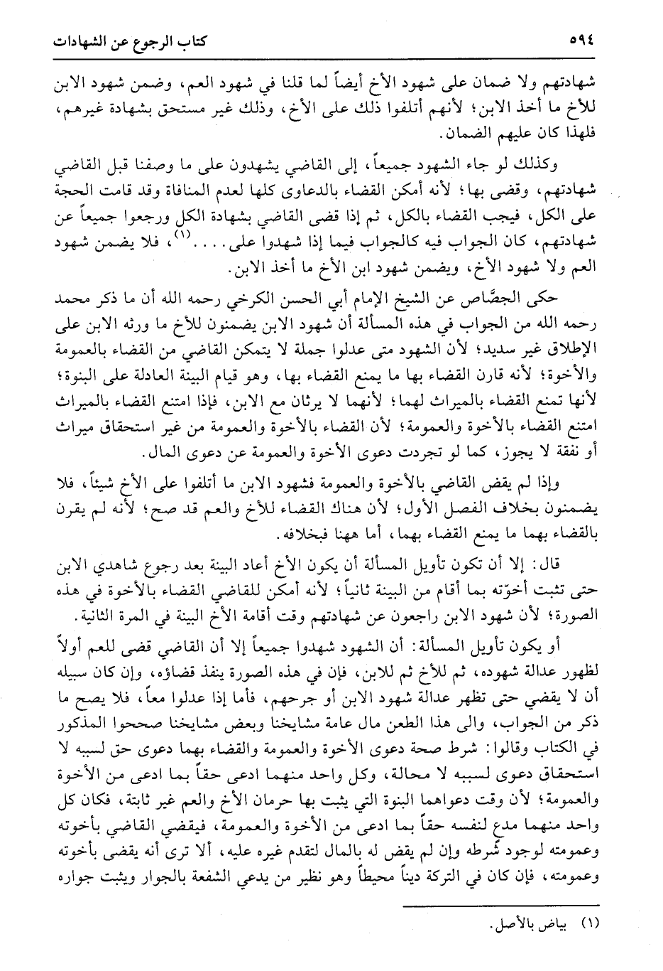 قال: إلا أن تكون تأويل المسألة أن يكون الأخ أعاد البينة بعد رجوع شاهدي الابن حتى تثبت أخوّته بما أقام من البينة ثانياً؛ لأنه أمكن للقاضي القضاء بالأخوة في هذه الصورة؛ لأن شهود الابن راجعون عن شهادتهم وقت أقامة الأخ البينة في المرة الثانية.