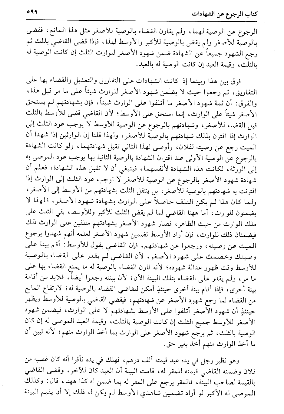 الرجوع عن الوصية لهما، ولم يقارن القضاء بالوصية للأصغر مثل هذا المانع، فقضى بالوصية للأصغر ولم يقض بالوصية للأكبر والأوسط لهذا، فإذا قضى القاضي بذلك ثم رجع الشهود جميعاً عن الشهادة ضمن شهود الأصغر للوارث الثلث إن كانت الوصية له بالثلث، وقيمة العبد إن كانت الوصية له بالعبد.