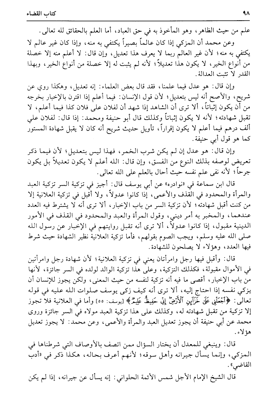 قال: وأقبل فيها رجل وامرأتان يعني في تزكية العلانية؛ لأن شهادة رجل وامرأتين في الأموال مقبولة، فكذلك التزكية، وعلى هذا تزكية الوالد لولده في السر جائزة، لأنها من باب الإخبار، أقصى ما فيه أنه تزكية لنفسه من حيث المعنى، ولكن يجوز للإنسان أن يزكي نفسه إذا احتاج إليه، ألا ترى أنه كيف زكى يوسف صلوات الله عليه في قوله تعالى: {اجعلني على خزائن الأرض إني حفيظ عليم} (يوسف: 55) وأما في العلانية فلا تجوز إلا تزكية من تقبل شهادته له، وكذلك على هذا تزكية العبد مولاه في السر جائزة وروى محمد عن أبي حنيفة أن يجوز تعديل العبد والمرأة والأعمى، وعن محمد: لا يجوز تعديل هؤلاء.