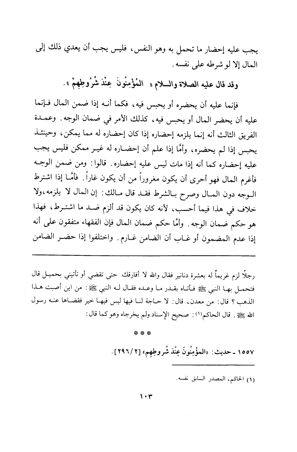 رجلًا لزم غريمًا له بعشرة دنانير فقال والله لا أفارقك حتى تقضي أو تأتيني بحميل قال فتحمل بها النبي - صلى الله عليه وسلم - فأتاه بقدر ما وعده فقال له النبي - صلى الله عليه وسلم -: من أين أصبت هذا الذهب؟ قال: من معدن، قال: لا حاجة لنا فيها ليس فيها خير فقضاها عنه رسول الله - صلى الله عليه وسلم -. قال الحاكم: صحيح الإِسناد ولم يخرجاه وهو كما قال: