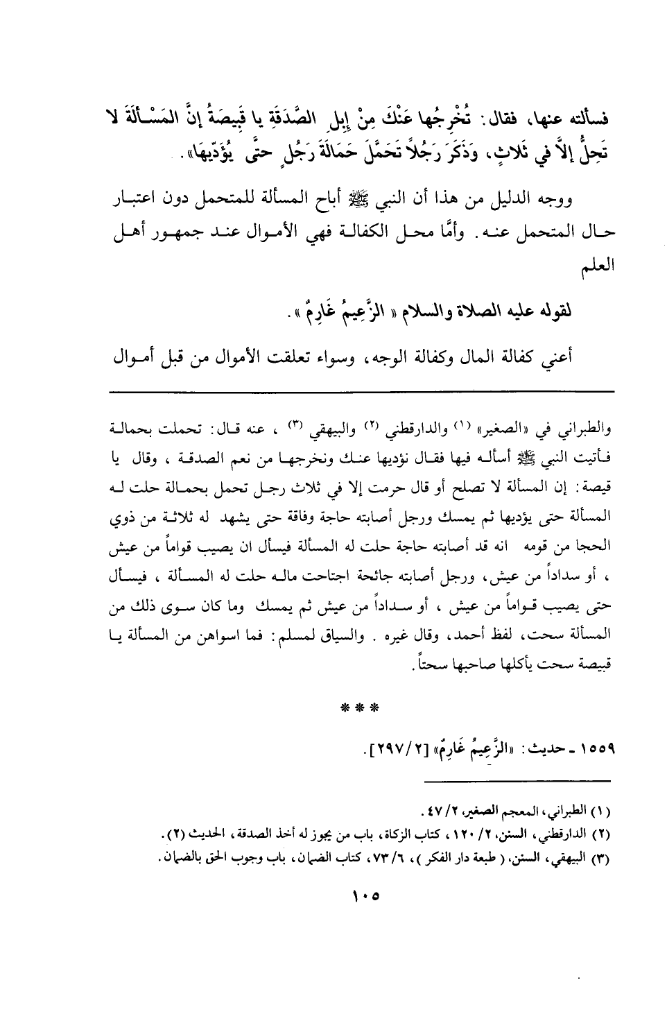والطبراني في "الصغير" والدارقطني والبيهقي، عنه قال: تحملت بحمالة فأتيت النبي - صلى الله عليه وسلم - أسأله فيها فقال نؤديها عنك ونخرجها من نعم الصدقة، وقال يا قيصة: إن المسألة لا تصلح أو قال حرمت إلا في ثلاث رجل تحمل بحمالة حلت له المسألة حتى يؤديها ثم يمسك ورجل أصابته حاجة وفاقة حتى يشهد له ثلاثة من ذوي الحجا من قومه إنّه قد أصابته حاجة حلت له المسألة فيسأل أَنْ يصيب قوامًا من عيش، أو سدادًا من عيش، ورجل أصابته جائحة اجتاحت ماله حلت له المسألة، فيسأل حتى يصيب قوامًا من عيش، أو سدادًا من عيش ثم يمسك وما كان سوى ذلك من المسألة سحت، لفظ أحمد، وقال غيره. والسياق لمسلم: فما أسوأهن من المسألة يا قبيصة سحت يأكلها صاحبها سحتًا.