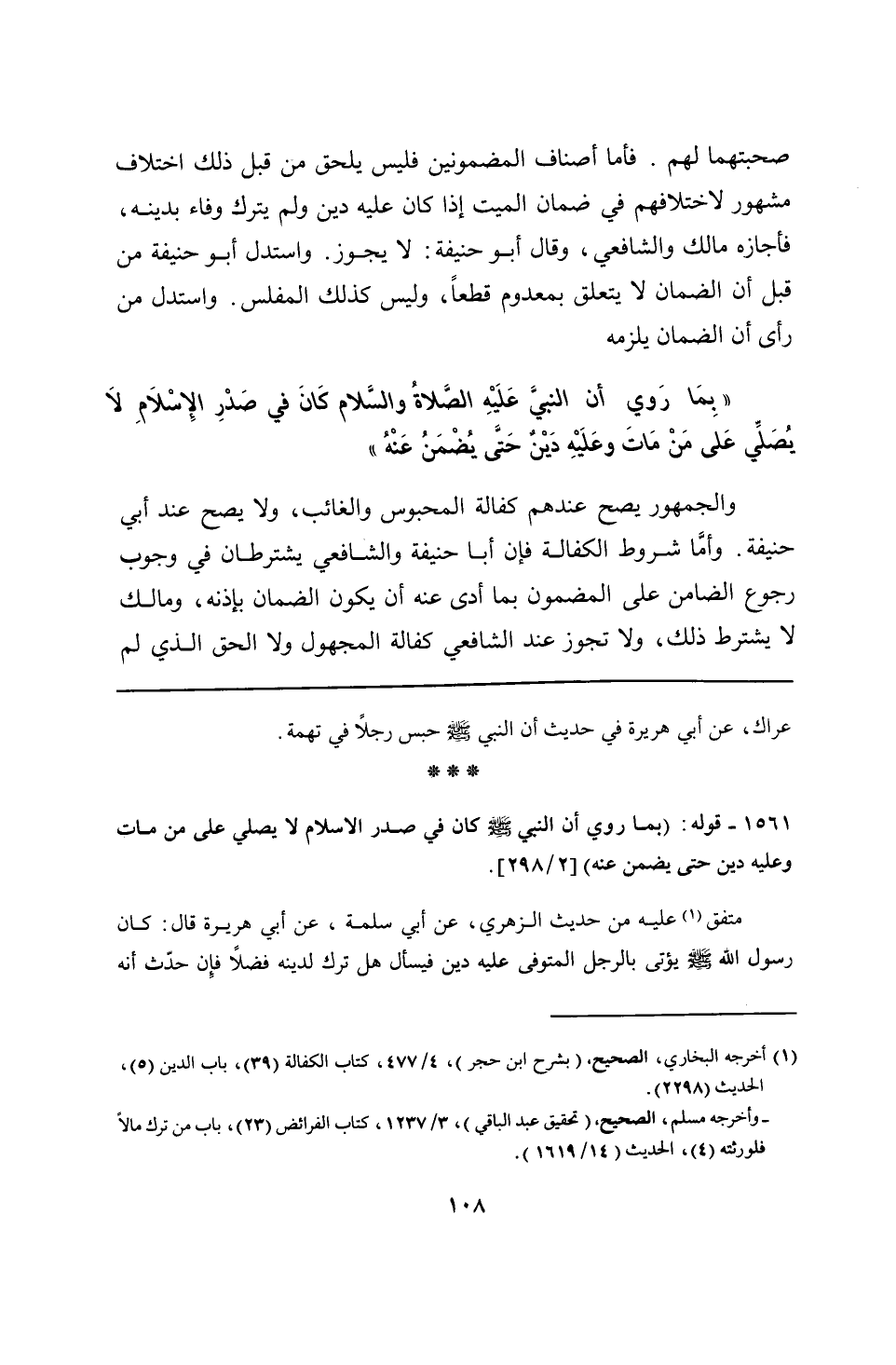 1561 - قوله: (بما روي أن النبي - صلى الله عليه وسلم - كان في صدر الاسلام لا يصلي على من مات وعليه دين حتى يضمن عنه).