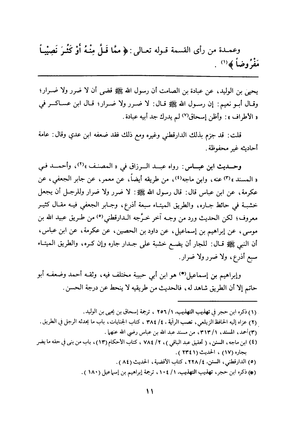 وحديث ابن عباس: رواه عبد الرزاق في "المصنف"، وأحمد في "المسند" عنه، وابن ماجه، من طريقه أيضًا، عن معمر، عن جابر الجعفي، عن عكرمة، عن ابن عباس قال: قال رسول الله - صلى الله عليه وسلم -: لا ضرر ولا ضرار وللرجل أن يجعل خشبة في حائط جاره، والطريق الميتاء سبعة أذرع، وجابر الجعفي فيه مقال كثير معروف؛ لكن الحديث ورد من وجه آخر خرجه الدارقطني من طريق عبيد الله بن موسى، عن إبراهيم بن إسماعيل، عن داود بن الحصين، عن عكرمة، عن ابن عباس، أن النبي - صلى الله عليه وسلم - قال: للجار أن يضع خشبة على جدار جاره وإن كره، والطريق الميتاء سبع أذرع، ولا ضرر ولا ضرار.