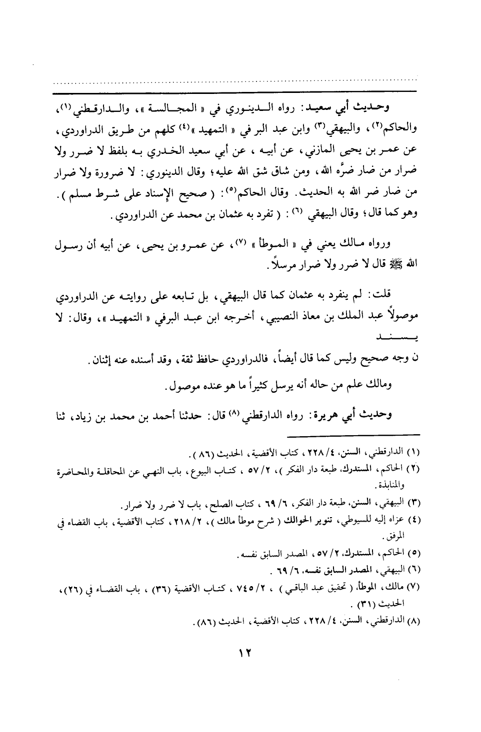 وحديث أبي سعيد: رواه الدينوري في "المجالسة"، والدارقطني، والحاكم، والبيهقي وابن عبد البر في "التمهيد" كلهم من طريق الدراوردي، عن عمر بن يحيى المازني، عن أبيه، عن أبي سعيد الخدري به بلفظ لا ضرر ولا ضرار من ضار ضرَّه الله، ومن شاق شق الله عليه؛ وقال الدينوري: لا ضرورة ولا ضرار من ضار ضر الله به الحديث. وقال الحاكم: (صحيح الإِسناد على شرط مسلم). وهو كما قال؛ وقال البيهقي: (تفرد به عثمان بن محمَّد عن الدراوردي.