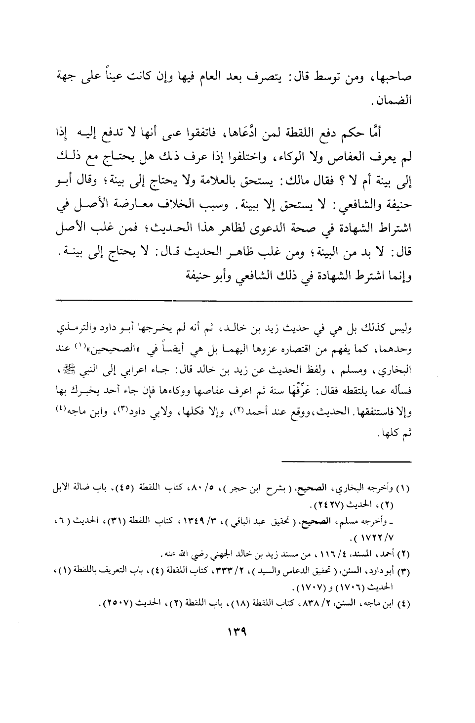 وليس كذلك بل هي في حديث زيد بن خالد، ثم أنه لم يخرجها أبو داود والترمذي وحدهما، كما يفهم من اقتصاره عزوها إليهما بل هي أيضًا في "الصحيحين" عند البخاري، ومسلم، ولفظ الحديث عن زيد بن خالد قال: جاء أعرابي إلى النبي - صلى الله عليه وسلم -، فسأله عما يلتقطه فقال: عَرِّفْهَا سنة ثم اعرف عفاصها ووكاءها فإِن جاء أحد يخبرك بها وإلا فاستنفقها. الحديث، ووقع عند أحمد، وإلا فكلها، ولأبي داود، وابن ماجه ثم كلها.