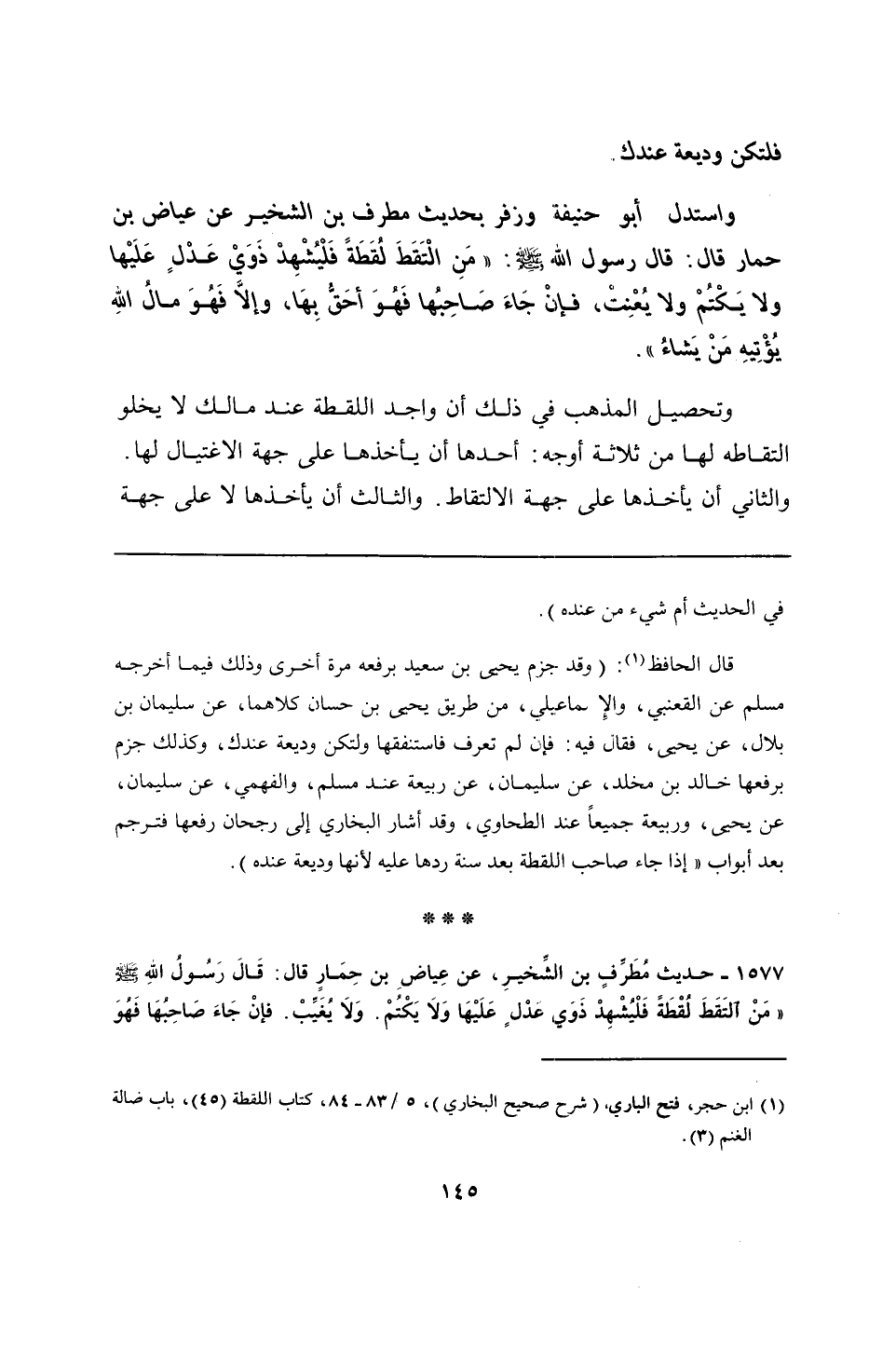 1577 - حديث مُطَرِّفٍ بن الشِّخيرِ، عن عِياضِ بن حِمَارٍ قال: قَالَ رَسُولُ اللهِ - صلى الله عليه وسلم - "مَنْ التَقَطَ لُقْطَةً فَلْيُشْهِدْ ذَوَي عدْلٍ عَلَيْهَا وَلَا يَكْتُمْ. وَلَا يُغَيِّبْ. فإنْ جَاءَ صَاحِبُهَا فَهُوَ