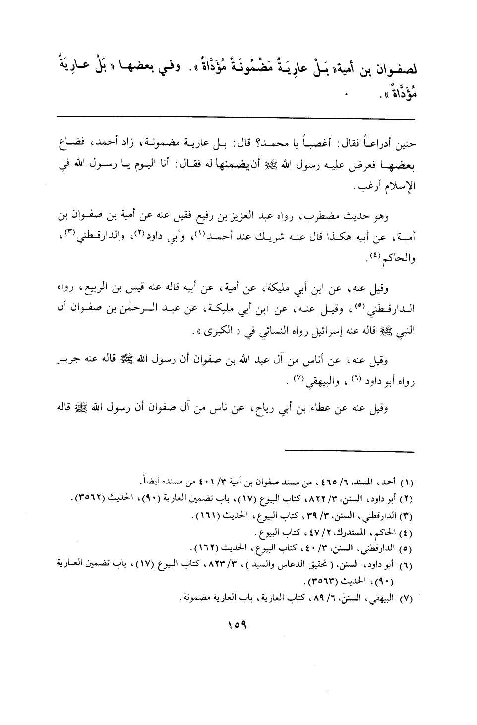 حنين أدراعًا فقال: أغصبًا يا محمد؟ قال: بل عارية مضمونة، زاد أحمد، فضاع بعضها فعرض عليه رسول الله - صلى الله عليه وسلم - أن يضمنها له فقال: أنا اليوم يا رسول الله في الإِسلام أرغب.