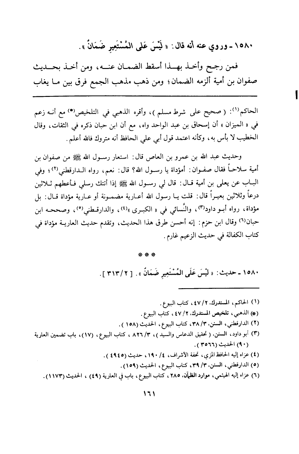 وحديث عبد الله بن عمرو بن العاص قال: استعار رسول الله - صلى الله عليه وسلم - من صفوان بن أمية سلاحًا فقال صفوان: أمؤداة يا رسول الله؟ قال: نعم، رواه الدارقطني؛ وفي الباب عن يعلى بن أمية قال: قال لي رسول الله - صلى الله عليه وسلم - إذا أتتك رسلي فأعطهم ثلاثين درعًا وثلاثين بعيرًا قال: قلت يا رسول الله أعارية مضمونة أو عارية مؤداة قال: بل مؤداة، رواه أبو داود، والنسائي في "الكبرى"، والدارقطني، وصححه ابن حبان وقال ابن حزم: إنه أحسن طرق هذا الحديث، وتقدم حديث العارية مؤداة في كتاب الكفالة في حديث الزعيم غارم.