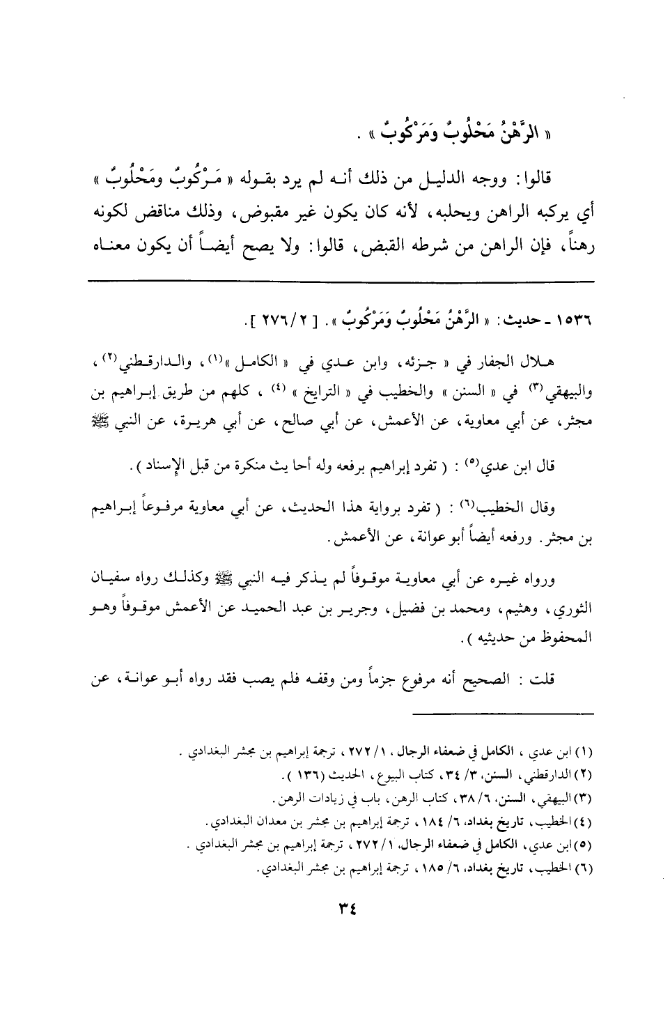 1536 - حديث: "الرَّهْنُ مَحْلُوبٌ وَمَرْكُوبٌ".