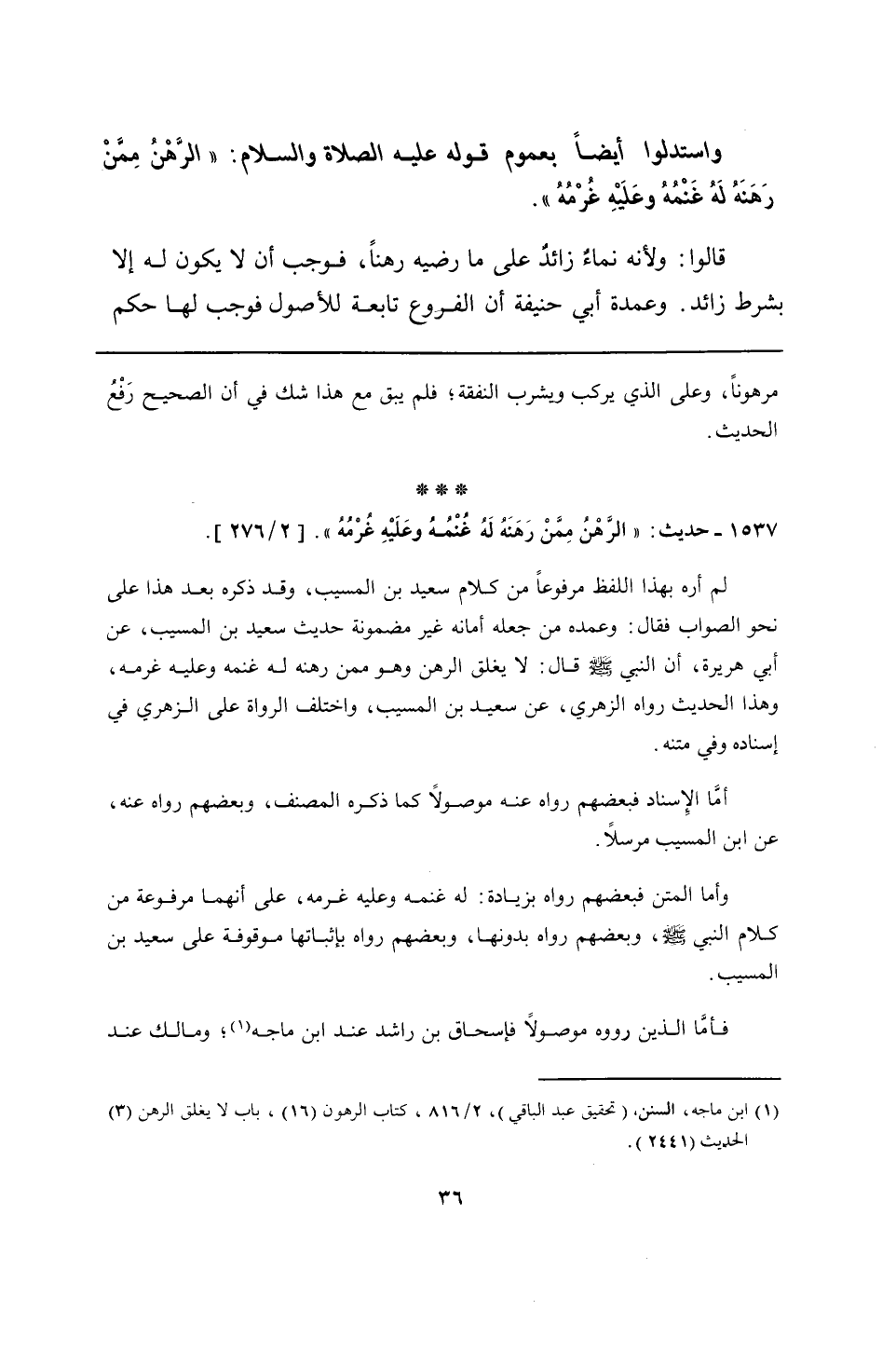 1537 - حديث: "الرَّهْنُ مِمَّنْ رَهَنَهُ لَهُ غُنْمُهُ وعَلَيْهِ غُرْمُهُ".