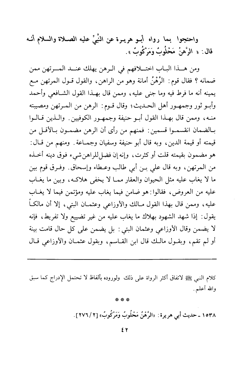 1538 - حديث أبي هريرة: "الرَّهْنُ مَحْلُوبٌ وَمَرْكُوبٌ".