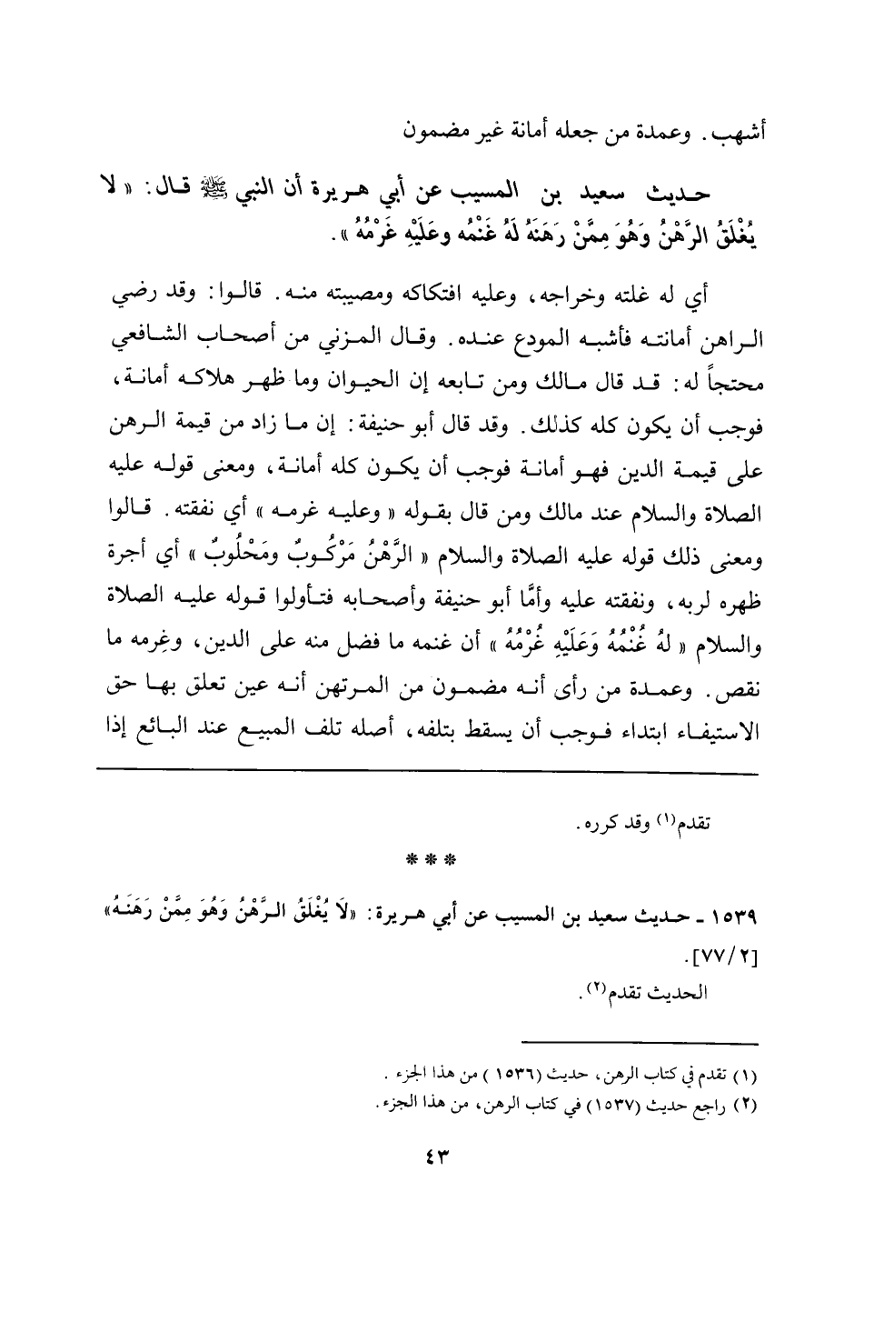 1539 - حديث سعيد بن المسيب عن أبي هريرة: "لَا يُغْلَقُ الرَّهْنُ وَهُوَ مِمَّنْ رَهَنَهُ".