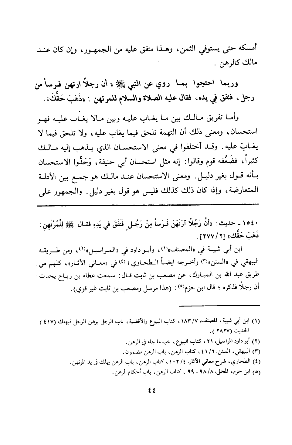 1540 - حديث: "أنَّ رَجُلًا ارَتَهَنَ فَرَسًا مِنْ رَجُلٍ فَنَفَقَ في يَدهِ فقال - صلى الله عليه وسلم - لِلْمُرْتَهِنِ: ذَهَبَ حَقُك".