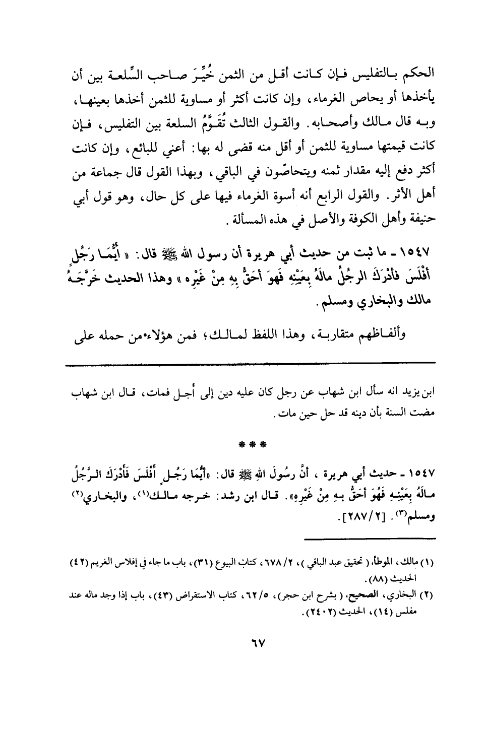 1547 - حديث أبي هريرة، أنَّ رسُولَ اللهِ - صلى الله عليه وسلم - قال: "أيُّمَا رَجُلٍ أفْلَسَ فَأدْرَكَ الرَّجُلُ مالَهُ بِعَيْنهِ فَهُوَ أحَقُّ بهِ مِنْ غَيْرِهِ". قال ابن رشد: خرّجه مالك، والبخاري ومسلم.