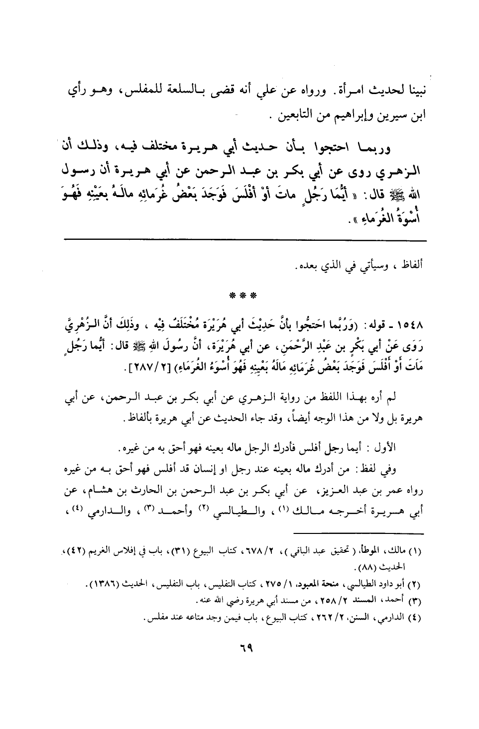 1548 - قوله: (وَرُبَّما احَتجُّوا بأنَّ حَدِيْثَ أبي هُرَيْرَة مخْتَلَفٌ فِيْه، وذَلِكَ أنَّ الزُهْرِيَّ رَوَى عَنْ أبي بَكْرٍ بن عَبْدِ الرحْمَنِ، عن أبي هُرَيْرَة، أنَّ رسُولَ اللهِ - صلى الله عليه وسلم - قال: أيُّما رَجُلٍ مَاَتَ أوْ أفْلَسَ فَوَجَدَ بَعْضُ غُرَمَائِهِ مَالَهُ بَعْيِنِهِ فَهُوَ أسْوَءُ الغرَمَاءِ).