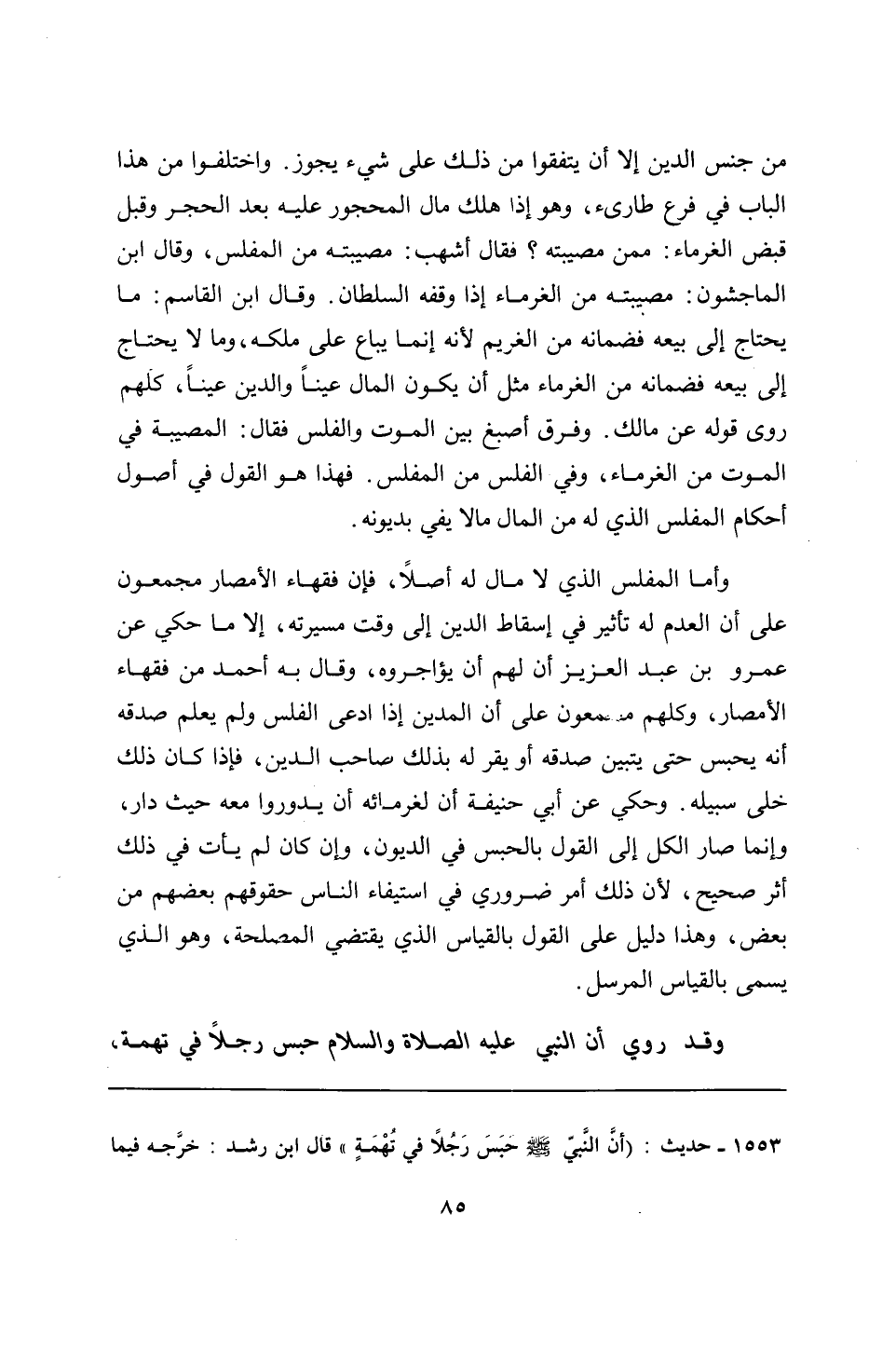 1553 - حديث: "أنَّ النَّبيّ - صلى الله عليه وسلم - حَبَسَ رَجُلًا في تُهْمَةٍ" قال ابن رشد: خرَّجه فيما