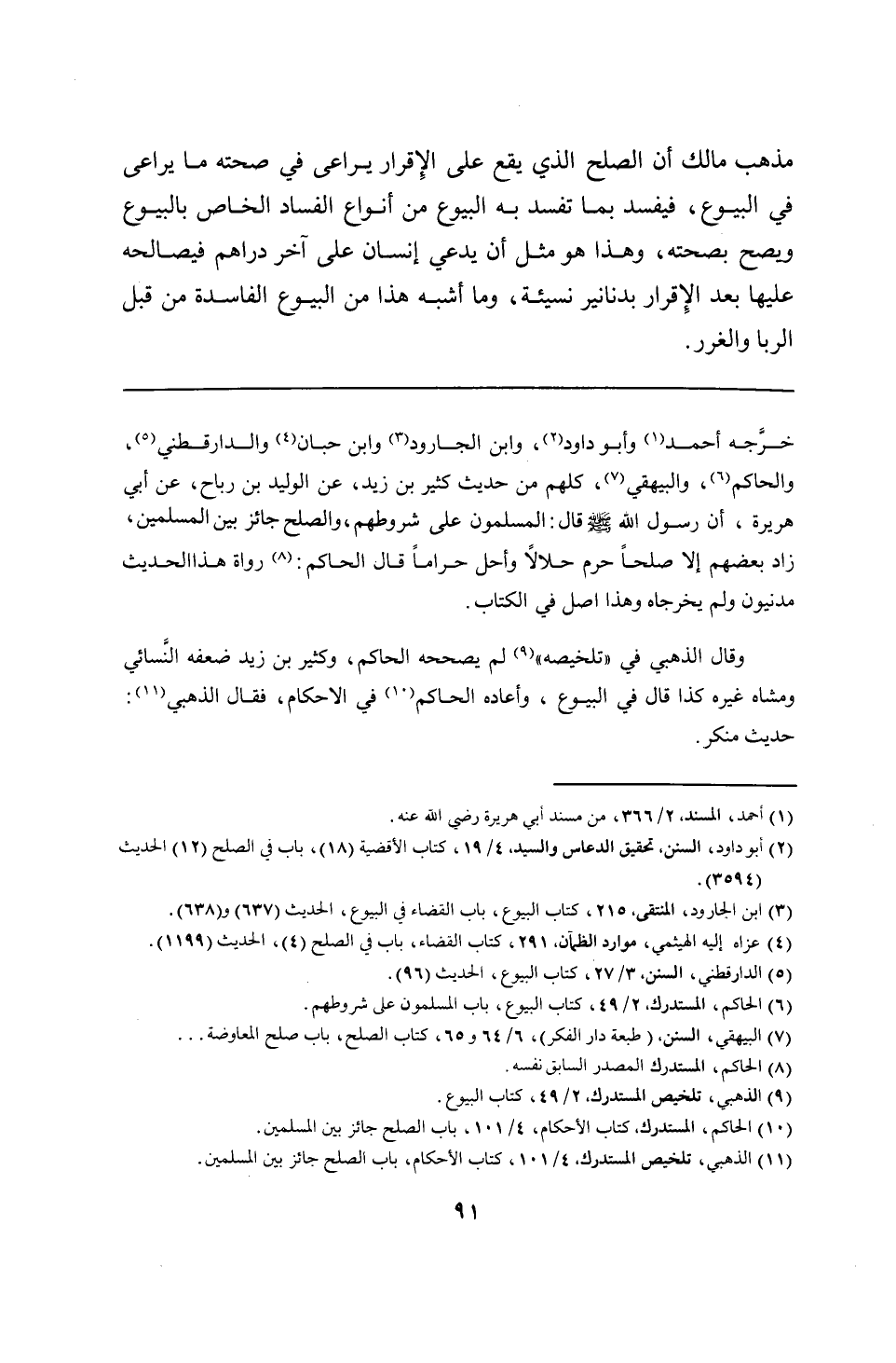 خرَّجه أحمد وأبو داود، وابن الجارود وابن حبان والدارقطني، والحاكم، والبيهقي، كلهم من حديث كثير بن زيد، عن الوليد بن رباح، عن أبي هريرة، أن رسول الله - صلى الله عليه وسلم - قال: المسلمون على شروطهم، والصلح جائز بين المسلمين، زاد بعضهم إلا صلحًا حرم حلالًا وأحل حرامًا قال الحاكم: رواة هذا الحديث مدنيون ولم يخرجاه وهذا أصل في الكتاب.