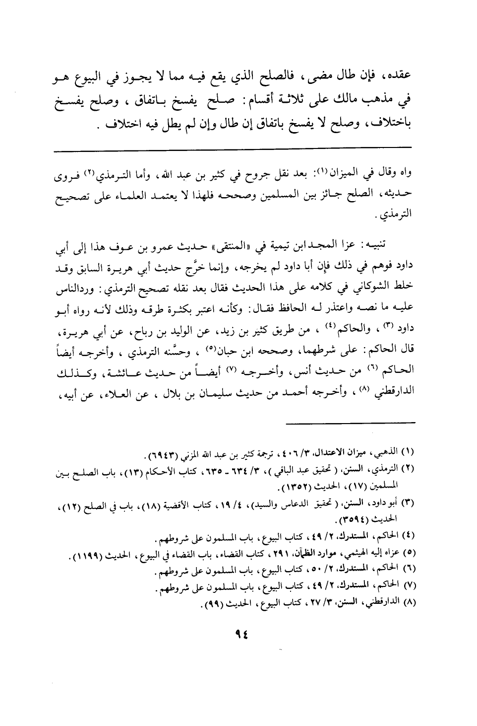 واه وقال في الميزان: بعد نقل جروح في كثير بن عبد الله، وأما الترمذي فروى حديثه، الصلح جائز بين المسلمين وصححه فلهذا لا يعتمد العلماء على تصحيح الترمذي.