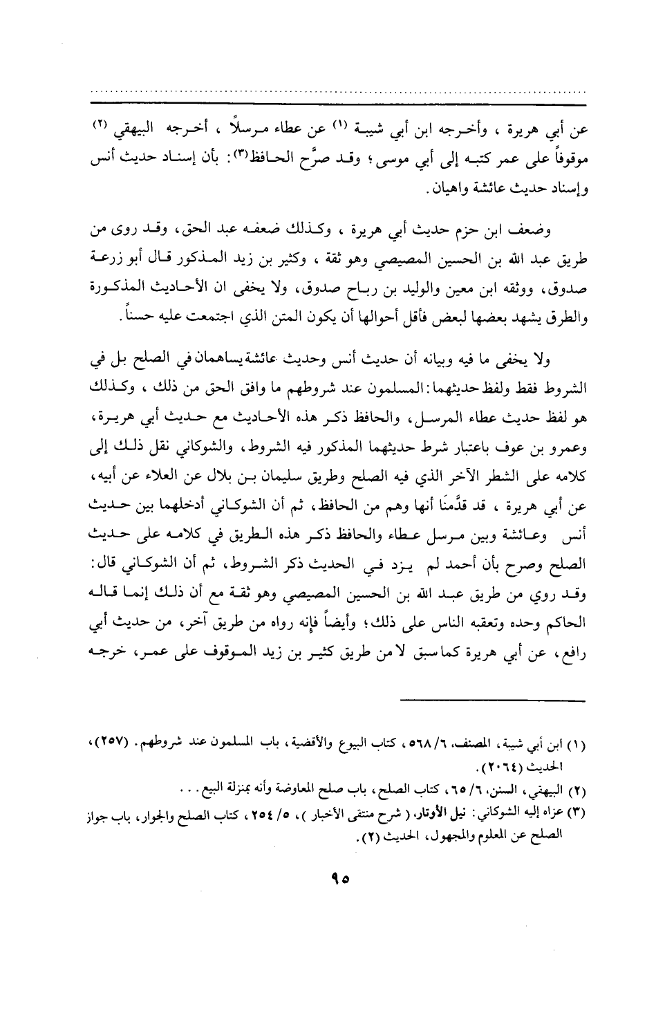 ولا يخفى ما فيه وبيانه أن حديث أنس وحديث. عائشة يساهمان في الصلح بل في الشروط فقط ولفظ حديثهما: المسلمون عند شروطهم ما وافق الحق من ذلك، وكذلك هو لفظ حديث عطاء المرسل، والحافظ ذكر هذه الأحاديث مع حديث أبي هريرة، وعمرو بن عوف باعتبار شرط حديثهما المذكور فيه الشروط، والشوكاني نقل ذلك إلى كلامه على الشطر الآخر الذي فيه الصلح وطريق سليمان بن بلال عن العلاء عن أبيه، عن أبي هريرة، قد قدَّمنَا أنها وهم من الحافظ، ثم أن الشوكاني أدخلهما بين حديث أنس وعائشة وبين مرسل عطاء والحافظ ذكر هذه الطريق في كلامه على حديث الصلح وصرح بأن أحمد لم يزد في الحديث ذكر الشروط، ثم أن الشوكاني قال: وقد روي من طريق عبد الله بن الحسين المصيصي وهو ثقة مع أن ذلك إنما قاله الحاكم وحده وتعقبه الناس على ذلك؛ وأيضًا فإِنه رواه من طريق آخر، من حديث أبي رافع، عن أبي هريرة كما سبق لا من طريق كثير بن زيد الموقوف على عمر، خرّجه