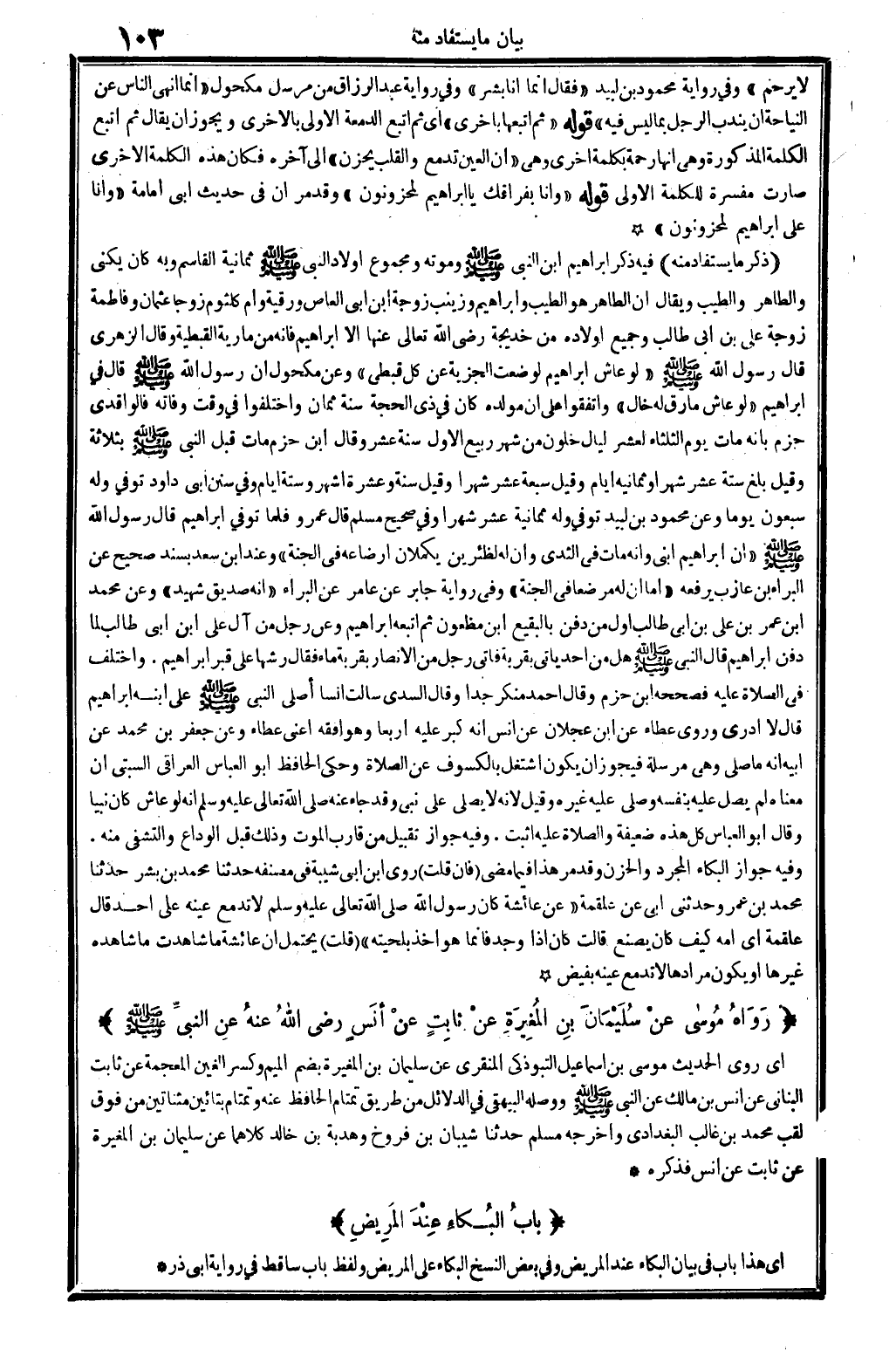 ذكر مَا يُسْتَفَاد مِنْهُ: فِيهِ: ذكر إِبْرَاهِيم ابْن النَّبِي صلى الله عَلَيْهِ وَسلم وَمَوته ومجموع أَوْلَاد النَّبِي صلى الله عَلَيْهِ وَسلم ثَمَانِيَة: الْقَاسِم وَبِه كَانَ يكنى، والطاهر وَالطّيب، وَيُقَال أَن الطَّاهِر هُوَ الطّيب، وَإِبْرَاهِيم وَزَيْنَب زَوْجَة ابْن أبي الْعَاصِ، ورقية وَأم كُلْثُوم زوجا عُثْمَان، وَفَاطِمَة زَوْجَة عَليّ بن أبي طَالب، وَجَمِيع أَوْلَاده من خَدِيجَة، رَضِي الله تَعَالَى عَنْهَا، إلاَّ ابراهيم فَإِنَّهُ من مَارِيَة الْقبْطِيَّة، وَقَالَ الزُّهْرِيّ: قَالَ رَسُول الله صلى الله عَلَيْهِ وَسلم (لَو عَاشَ إِبْرَاهِيم لوضعت الْجِزْيَة على كل قبْطِي) ، وَعَن مَكْحُول أَن رَسُول الله صلى الله عَلَيْهِ وَسلم قَالَ فِي إِبْرَاهِيم: (لَو عَاشَ مَا رق لَهُ خَال) ، وَاتَّفَقُوا على أَن مولده كَانَ فِي ذِي الْحجَّة سنة ثَمَان، وَاخْتلفُوا فِي وَقت وَفَاته، فالواقدي جزم بِأَنَّهُ مَاتَ يَوْم الثُّلَاثَاء لعشر لَيَال خلون من شهر ربيع الأول سنة عشر، وَقَالَ ابْن حزم: مَاتَ قبل النَّبِي صلى الله عَلَيْهِ وَسلم بِثَلَاثَة، وَقيل: بلغ سِتَّة عشر شهرا وَثَمَانِية أَيَّام، وَقيل: سَبْعَة عشر شهرا، وَقيل: سنة وَعشرَة أشهر وَسِتَّة أَيَّام، وَفِي (سنَن أبي دَاوُد) : توفّي وَله سَبْعُونَ يَوْمًا. وَعَن مَحْمُود بن لبيد: توفّي وَله ثَمَانِيَة عشر شهرا. وَفِي (صَحِيح مُسلم) : قَالَ عَمْرو: فَلَمَّا توفّي إِبْرَاهِيم قَالَ رَسُول الله صلى الله عَلَيْهِ وَسلم: (إِن إِبْرَاهِيم ابْني وَإنَّهُ مَاتَ فِي الثدي وَإِن لَهُ لظئرين يكملان إرضاعه فِي الْجنَّة) . وَعند ابْن سعد بِسَنَد صَحِيح عَن الْبَراء بن عَازِب يرفعهُ: (أما أَن لَهُ مُرْضعًا فِي الْجنَّة) . وَفِي رِوَايَة جَابر عَن عَامر عَن الْبَراء: (إِنَّه صديق شَهِيد) ، وَعَن مُحَمَّد ابْن عمر بن عَليّ بن أبي طَالب: أول من دفن بِالبَقِيعِ ابْن مَظْعُون، ثمَّ اتبعهُ إِبْرَاهِيم، وَعَن رجل من آل عَليّ بن أبي طَالب: لما دفن إِبْرَاهِيم قَالَ النَّبِي صلى الله عَلَيْهِ وَسلم: هَل من أحد يَأْتِي بقربة؟ فَأتى رجل من الْأَنْصَار بقربة مَاء، فَقَالَ: رشها على قبر إِبْرَاهِيم.