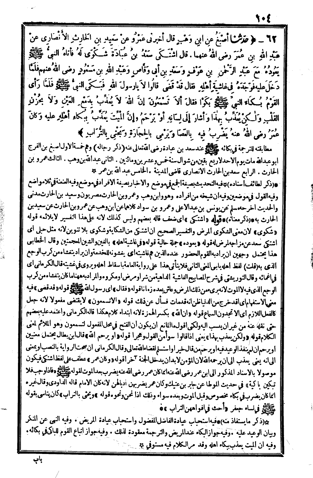 62 - (حَدثنَا أصبغ عَن ابْن وهب قَالَ أَخْبرنِي عَمْرو عَن سعيد بن الْحَارِث الْأنْصَارِيّ عَن عبد الله بن عمر رَضِي الله عَنْهُمَا. قَالَ اشْتَكَى سعد بن عبَادَة شكوى لَهُ فَأَتَاهُ النَّبِي - صَلَّى اللَّهُ عَلَيْهِ وَسَلَّم َ - يعودهُ مَعَ عبد الرَّحْمَن بن عَوْف وَسعد بن أبي وَقاص وَعبد الله بن مَسْعُود رَضِي الله عَنْهُم فَلَمَّا دخل عَلَيْهِ فَوَجَدَهُ فِي غاشية أَهله فَقَالَ قد قضى قَالُوا لَا يَا رَسُول الله فَبكى النَّبِي - صَلَّى اللَّهُ عَلَيْهِ وَسَلَّم َ - فَلَمَّا رأى الْقَوْم بكاء النَّبِي - صَلَّى اللَّهُ عَلَيْهِ وَسَلَّم َ - بكوا فَقَالَ أَلا تَسْمَعُونَ إِن الله لَا يعذب بدمع الْعين وَلَا بحزن الْقلب وَلَكِن يعذب بِهَذَا وَأَشَارَ إِلَى لِسَانه أَو برحم وَإِن الْمَيِّت يعذب ببكاء أَهله عَلَيْهِ وَكَانَ عمر رَضِي الله عَنهُ يضْرب فِيهِ بالعصا وَيَرْمِي بِالْحِجَارَةِ ويحثي بِالتُّرَابِ) مطابقته للتَّرْجَمَة فِي بكائه - صَلَّى اللَّهُ عَلَيْهِ وَسَلَّم َ - عِنْد سعد بن عبَادَة رَضِي الله تَعَالَى عَنهُ. (ذكر رِجَاله) وهم خَمْسَة. الأول أصبغ بن الْفرج أَبُو عبد الله مَاتَ يَوْم الْأَحَد لأَرْبَع بَقينَ من شَوَّال سنة خمس وَعشْرين وَمِائَتَيْنِ. الثَّانِي عبد الله بن وهب. الثَّالِث عَمْرو بن الْحَارِث. الرَّابِع سعد بن الْحَارِث الْأنْصَارِيّ قَاضِي الْمَدِينَة. الْخَامِس عبد الله بن عمر (ذكر لطائف إِسْنَاده) فِيهِ التحديث بِصِيغَة الْجمع فِي مَوضِع والإخبار بِصِيغَة الْإِفْرَاد فِي مَوضِع وَفِيه العنعنة فِي ثَلَاث مَوَاضِع وَفِيه القَوْل فِي موضِعين وَفِيه أَن شَيْخه من أَفْرَاده وَهُوَ وَابْن وهب وَعَمْرو بن الْحَارِث مصريون وَسَعِيد بن الْحَارِث مدنِي والْحَدِيث أخرجه مُسلم عَن يُونُس بن عبد الْأَعْلَى وَعَمْرو بن سَواد كِلَاهُمَا عَن ابْن وهب عَن عَمْرو بن الْحَارِث عَن سعيد بن الْحَارِث بِهِ. (ذكر مَعْنَاهُ) قَوْله " اشْتَكَى " أَي ضعف قَالَه بَعضهم وَلَيْسَ كَذَلِك لِأَنَّهُ على هَذَا التَّفْسِير لَا يلائمه قَوْله " شكوى " لِأَن معنى الشكوى الْمَرَض وَالتَّفْسِير الصَّحِيح أَن اشتكي من الشكاية وشكوى بِلَا تَنْوِين لِأَنَّهُ مثل حُبْلَى أَي اشْتَكَى سعد عَن مزاجه لمَرض لَهُ قَوْله " يعودهُ " جملَة حَالية قَوْله " فِي غاشية أَهله " بالغين والشين المعجمتين وَقَالَ الْخطابِيّ هَذَا يحْتَمل وَجْهَيْن أَن يُرَاد بِهِ الْقَوْم الْحُضُور عِنْده الَّذين هم غاشيته أَي يغشونه للْخدمَة وَأَن يُرَاد يتغشاه من كرب الوجع الَّذِي بِهِ (قلت) لفظ أَهله يَأْبَى الْمَعْنى الثَّانِي فَلَا يَتَأَتَّى هَذَا على رِوَايَة الْعَامَّة بِإِسْقَاط أَهله ويروى فِي غَشيته قَالَ الْكرْمَانِي أَي فِي إغمائه وَقَالَ التوريشتي فِي شرح المصابيح الغاشية الداهية من شَرّ أَو مرض أَو مَكْرُوه وَالْمرَاد بِهِ هَهُنَا مَا كَانَ يتغشاه من كرب الوجع الَّذِي فِيهِ لَا الْمَوْت لِأَنَّهُ بَرِيء من ذَلِك الْمَرَض وعاش بعده زَمَانا قَوْله " فَقَالَ " أَي رَسُول الله - صَلَّى اللَّهُ عَلَيْهِ وَسَلَّم َ - قَوْله " قد قضى " فِيهِ معنى الِاسْتِفْهَام أَي أقد خرج من الدُّنْيَا ظن أَنه قد مَاتَ فَسَأَلَ عَن ذَلِك قَوْله " أَلا تَسْمَعُونَ " لَا يَقْتَضِي مَفْعُولا لِأَنَّهُ جعل كالفعل اللَّازِم أَي أَلا تَجِدُونَ السماع قَوْله " إِن الله " بِكَسْر الْهمزَة لِأَنَّهُ ابْتِدَاء كَلَام هَكَذَا قَالَه الْكرْمَانِي وَاعْتمد عَلَيْهِ بَعضهم حَتَّى نَقله عَنهُ من غير أَن ينْسب إِلَيْهِ وَلَكِنِّي أَقُول مَا الْمَانِع أَن يكون أَن الْفَتْح فِي مَحل الْمَفْعُول لتسمعون وَهُوَ الملائم لِمَعْنى الْكَلَام قَوْله " وَلَكِن يعذب بِهَذَا " يَعْنِي إِذا قَالُوا سوأ من القَوْل وهجرا قَوْله " أَو يرحم الله " قَالَ ابْن بطال يحْتَمل مَعْنيين أَو يرحم إِن لم ينفذ الْوَعيد فِي