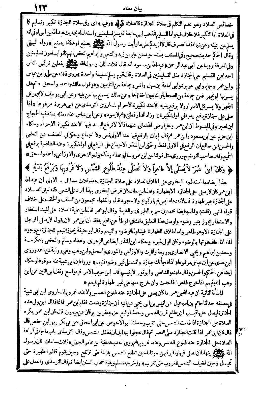 الْمَسْأَلَة الثَّانِيَة: أَن عبد الله بن عمر مَا كَانَ يُصَلِّي على الْجِنَازَة عِنْد طُلُوع الشَّمْس وَلَا عِنْد غُرُوبهَا لما روى ابْن أبي شيبَة فِي (مُصَنفه) : حَدثنَا حَاتِم بن إِسْمَاعِيل عَن أنيس بن أبي يحيى عَن أَبِيه أَن جَنَازَة وضعت، فَقَامَ ابْن عمر قَائِما فَقَالَ: أَيْن ولي هَذِه الْجِنَازَة؟ ليصل عَلَيْهَا قبل أَن يطلع قرن الشَّمْس. وَحدثنَا وَكِيع عَن جَعْفَر بن برْقَان عَن مَيْمُون، قَالَ: كَانَ ابْن عمر يكره الصَّلَاة على الْجِنَازَة إِذا طلعت الشَّمْس حَتَّى تغيب، وَحدثنَا أَبُو الْأَحْوَص عَن أبي إِسْحَاق عَن أبي بكر، يَعْنِي ابْن حَفْص، قَالَ: كَانَ ابْن عمر إِذا كَانَت الْجِنَازَة صلى الْعَصْر ثمَّ قَالَ: عجلوا بهَا قبل أَن تطفل الشَّمْس. وَقَالَ التِّرْمِذِيّ: بَاب مَا جَاءَ فِي كَرَاهَة الصَّلَاة على الْجِنَازَة عِنْد طُلُوع الشَّمْس وَعند غُرُوبهَا، ثمَّ روى حَدِيث عقبَة بن عَامر الْجُهَنِيّ: (ثَلَاث سَاعَات كَانَ رَسُول الله صلى الله عَلَيْهِ وَسلم ينهانا أَن نصلي فِيهَا، ونقبر فِيهِنَّ مَوتَانا، حِين تطلع الشَّمْس: بازغة حَتَّى ترْتَفع، وَحين يقوم قَائِم الظهيرة حَتَّى تميل، وَحين تضيف الشَّمْس للغروب حَتَّى تغرب) . وَأخرجه مُسلم وَبَقِيَّة أَصْحَاب السّنَن أَيْضا، ثمَّ قَالَ التِّرْمِذِيّ: وَالْعَمَل على