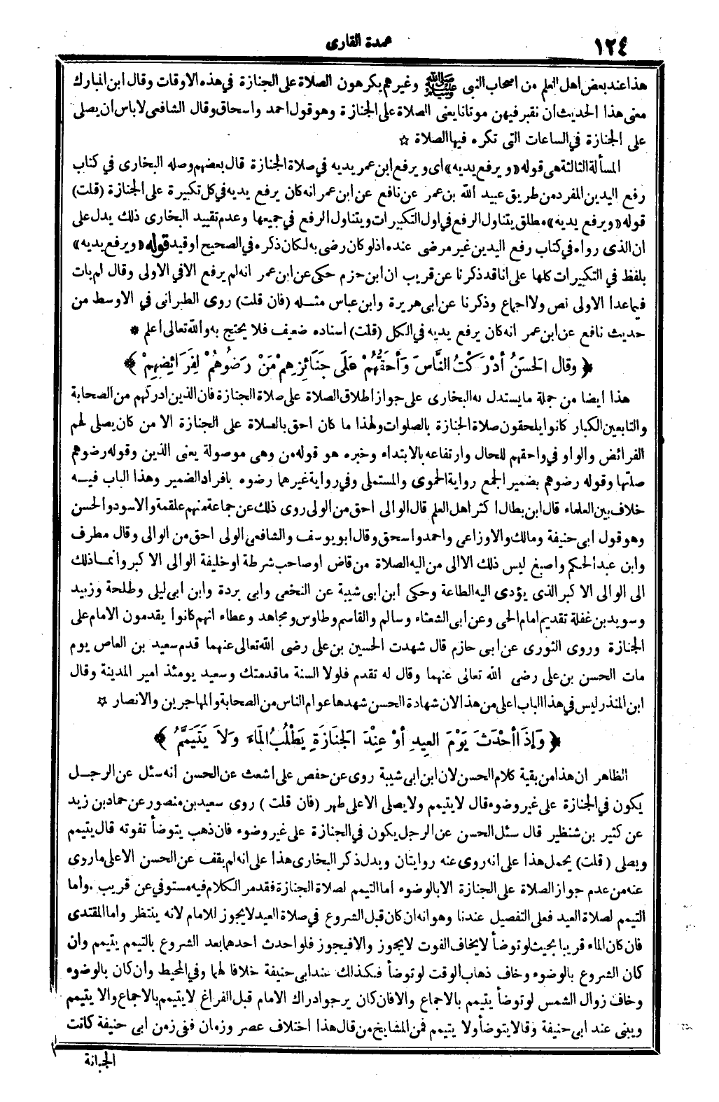 الظَّاهِر أَن هَذَا من بَقِيَّة كَلَام الْحسن، لِأَن ابْن أبي شيبَة روى عَن حَفْص على أَشْعَث عَن الْحسن أَنه سُئِلَ عَن الرجل يكون فِي الْجِنَازَة على غير وضوء، قَالَ: لَا يتَيَمَّم وَلَا يُصَلِّي إلاَّ على طهر. فَإِن قلت: روى سعيد بن مَنْصُور عَن حَمَّاد بن زيد عَن كثير بن شنظير، قَالَ: سُئِلَ الْحسن عَن الرجل يكون فِي الْجِنَازَة على غير وضوء، فَإِن ذهب يتَوَضَّأ تفوته. قَالَ: يتَيَمَّم وَيُصلي. قلت: يحمل هَذَا على أَنه روى عَنهُ رِوَايَتَانِ، وَيدل ذكر البُخَارِيّ هَذَا على أَنه لم يقف عَن الْحسن إلاَّ على مَا روى عَنهُ من عدم جَوَاز الصَّلَاة على الْجِنَازَة إلاَّ بِالْوضُوءِ، أما التَّيَمُّم لصَلَاة الْجِنَازَة فقد مر الْكَلَام فِيهِ مُسْتَوفى عَن قريب.