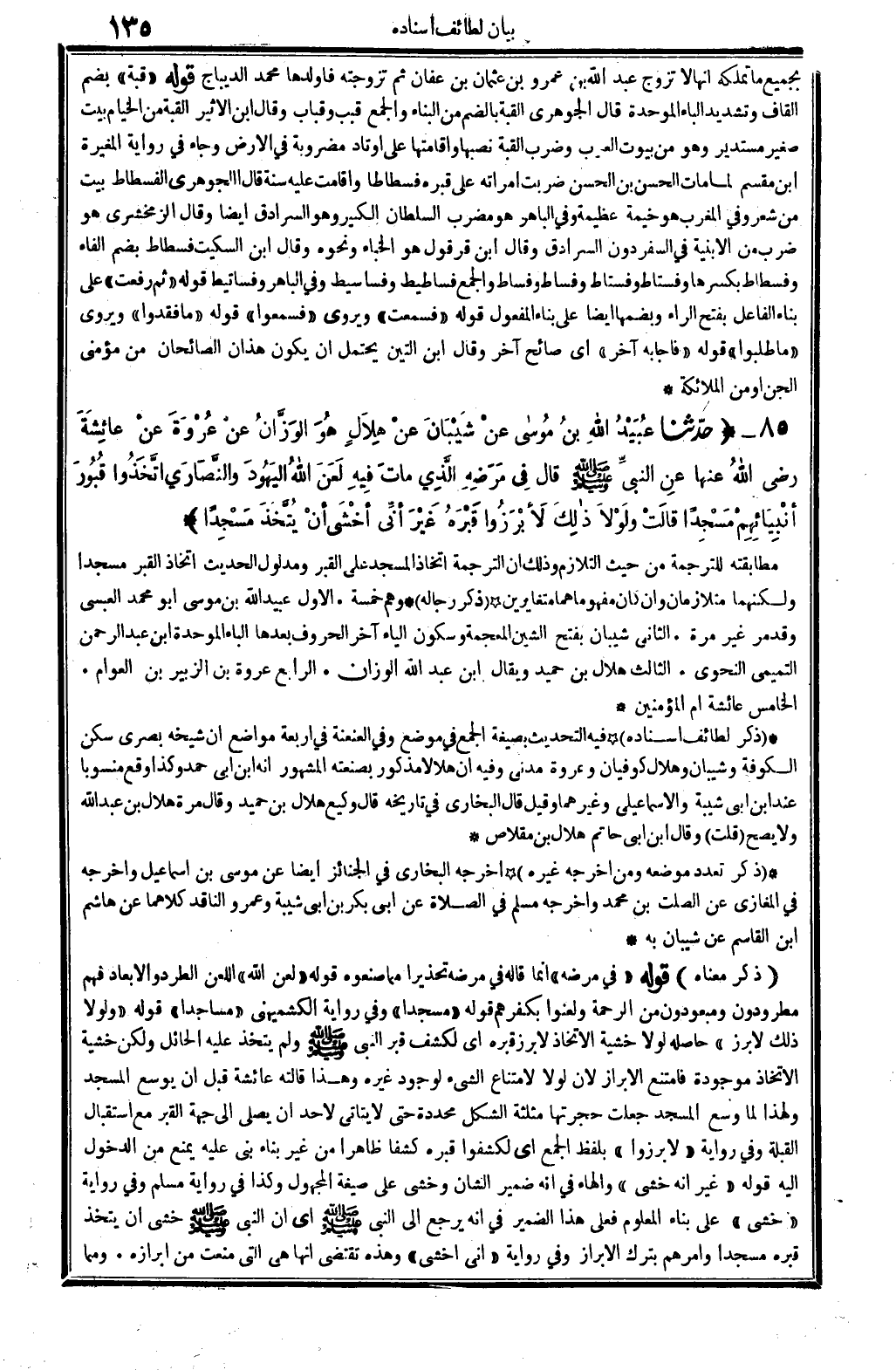 0331 - حدَّثنا عُبَيْدُ الله بنُ مُوسى اعنْ شيْبَانَ عنْ هِلاَلٍ هُوَ الوَزَّانُ عنْ عُرْوَةَ عنْ عائِشَةَ رَضِي الله تَعَالَى عَنْهَا عنِ النَّبيِّ صلى الله عَلَيْهِ وَسلم قَالَ فِي مرَضِهِ الَّذِي ماتَ فِيهِ لَعَنَ الله اليَهُودَ والنَّصَارى اتَّخَذُوا قُبُورَ أنْبِيَائِهِمْ مَسْجِدا قالَتْ ولَوْلاَ ذالِكَ لأَبْرَزُوا قَبْرَهُ غَيْرَ أنِّي أخْشَى أنْ يُتَّخَذَ مَسْجِدا..