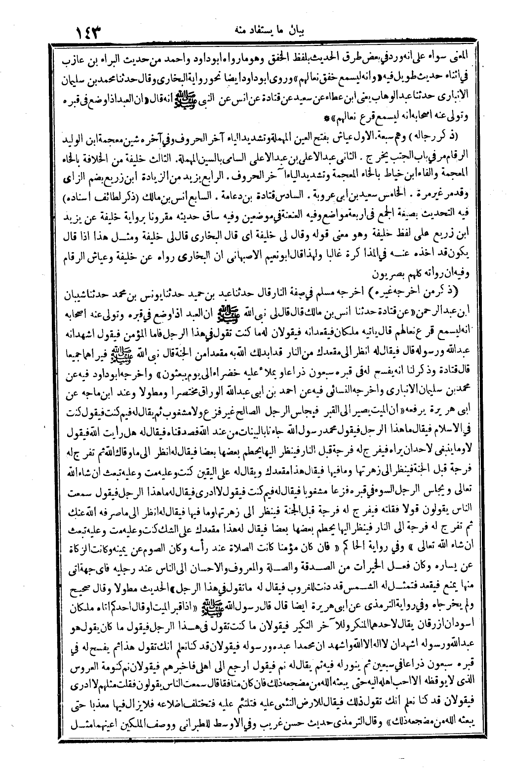 ذكر من أخرجه غَيره: أخرجه مُسلم فِي صفة النَّار، قَالَ: حَدثنَا عبد بن حميد حَدثنَا يُونُس بن مُحَمَّد حَدثنَا شَيبَان ابْن عبد الرَّحْمَن (عَن قَتَادَة حَدثنَا أنس بن مَالك، قَالَ: قَالَ لي نبيّ الله صلى الله عَلَيْهِ وَسلم: إِن العَبْد إِذا وضع فِي قَبره وَتَوَلَّى عَنهُ أَصْحَابه إِنَّه ليسمع قرع نعَالهمْ. قَالَ: يَأْتِيهِ ملكان فَيُقْعِدَانِهِ فَيَقُولَانِ لَهُ: مَا كنت تَقول فِي هَذَا الرجل؟ فَأَما الْمُؤمن فَيَقُول: أشهد أَنه عبد الله وَرَسُوله، قَالَ: فَيُقَال لَهُ أنظر إِلَى مَقْعَدك من النَّار، قد أبدلك الله بِهِ مقْعدا من الْجنَّة. قَالَ نَبِي الله صلى الله عَلَيْهِ وَسلم: فَيَرَاهُمَا جَمِيعًا. قَالَ قَتَادَة: وَذكر لنا أَنه يفسح لَهُ فِي قَبره سَبْعُونَ ذِرَاعا، ويملأ عَلَيْهِ خضراء إِلَى يَوْم يبعثون) . وَأخرجه أَبُو دَاوُد فِيهِ عَن مُحَمَّد بن سُلَيْمَان الْأَنْبَارِي، وَأخرجه النَّسَائِيّ فِيهِ عَن أَحْمد بن أبي عبد الله الْوراق مُخْتَصرا وَمُطَولًا. وَعند ابْن مَاجَه عَن أبي هُرَيْرَة، يرفعهُ: (إِن الْمَيِّت يصير إِلَى الْقَبْر فيجلس الرجل الصَّالح غير فزع وَلَا مشغوب، ثمَّ يُقَال لَهُ: فيمَ كنت؟ فَيَقُول: كنت فِي الْإِسْلَام، فَيُقَال: مَا هَذَا الرجل؟ فَيَقُول: مُحَمَّد رَسُول الله جَاءَنَا بِالْبَيِّنَاتِ من عِنْد الله فَصَدَّقْنَاهُ، فَيُقَال لَهُ: هَل رَأَيْت الله؟ فَيَقُول لَا، وَمَا يَنْبَغِي لأحد أَن يرَاهُ، فيفرج لَهُ فُرْجَة قبل النَّار، فَينْظر إِلَيْهَا يحطم بَعْضهَا بَعْضًا، فَيُقَال لَهُ: أنظر ألى مَا وقاك الله، ثمَّ تفرج لَهُ فُرْجَة قبل الْجنَّة، فَينْظر إِلَى زهرتها وَمَا فِيهَا، فَيُقَال: هَذَا مَقْعَدك، وَيُقَال لَهُ: على الْيَقِين كنت، وَعَلِيهِ مت، وَعَلِيهِ تبْعَث إِن شَاءَ الله تَعَالَى. وَيجْلس الرجل السوء فِي قَبره فَزعًا مشغوباً، فَيُقَال لَهُ: فيمَ كنت؟ فَيَقُول: لَا أَدْرِي، فَيُقَال لَهُ: مَا هَذَا الرجل؟ فَيَقُول: سَمِعت النَّاس يَقُولُونَ قولا فقلته، فيفرج لَهُ فُرْجَة قبل الْجنَّة، فَينْظر إِلَى زهرتها وَمَا فِيهَا، فَيُقَال لَهُ أنظر إِلَى مَا صرفه الله عَنْك، ثمَّ تفرج لَهُ فُرْجَة إِلَى النَّار، فَينْظر إِلَيْهَا يحطم بَعْضهَا بَعْضًا فَيُقَال لَهُ: هَذَا مَقْعَدك، على الشَّك كنت، وَعَلِيهِ مت، وَعَلِيهِ تبْعَث إِن شَاءَ الله تَعَالَى) . وَفِي رِوَايَة الْحَاكِم: (فَإِن كَانَ مُؤمنا كَانَت الصَّلَاة عِنْد رَأسه، وَكَانَ الصَّوْم عَن يَمِينه، وَكَانَت الزَّكَاة عَن يسَاره وَكَانَ فعل الْخيرَات من الصَّدَقَة والصلة وَالْمَعْرُوف وَالْإِحْسَان إِلَى النَّاس عِنْد رجلَيْهِ، فَأَي جِهَة أَتَى مِنْهَا يمْنَع، فيقعد فتمثل لَهُ الشَّمْس قد دنت للغروب، فَيُقَال لَهُ: مَا تَقول فِي هَذَا الرجل ... ؟ الحَدِيث مطولا. وَقَالَ: صَحِيح وَلم يخرجَاهُ، وَفِي رِوَايَة التِّرْمِذِيّ عَن أبي هُرَيْرَة أَيْضا، قَالَ: قَالَ رَسُول الله صلى الله عَلَيْهِ وَسلم: (إِذا قبر الْمَيِّت، أَو قَالَ: أحدكُم أَتَاهُ ملكان أسودان أزرقان يُقَال لأَحَدهمَا الْمُنكر، وَللْآخر: النكير. فَيَقُولَانِ: مَا كنت تَقول فِي هَذَا الرجل؟ فَيَقُول، مَا كَانَ يَقُول: هُوَ عبد الله وَرَسُوله أشهد إِن لَا إِلَه إلاَّ الله وَأشْهد أَن مُحَمَّدًا عَبده وَرَسُوله، فَيَقُولَانِ قد كُنَّا نعلم أَنَّك تَقول هَذَا، ثمَّ يفسح لَهُ فِي قَبره سَبْعُونَ ذِرَاعا فِي سبعين، ثمَّ ينور لَهُ فِيهِ، ثمَّ يُقَال لَهُ: نم، فَيَقُول أرجع إِلَى أَهلِي فَأخْبرهُم، فَيَقُولَانِ: نم كنومة الْعَرُوس الَّذِي لَا يوقظه إلاَّ أحب أَهله إِلَيْهِ حَتَّى يَبْعَثهُ الله من مضجعه ذَلِك، فَإِن كَانَ منافقا، قَالَ: سَمِعت النَّاس يَقُولُونَ فَقلت مثلهم لَا أَدْرِي، فَيَقُولَانِ قد كُنَّا نعلم أَنَّك تَقول ذَلِك، فَيُقَال للْأَرْض التئمي عَل