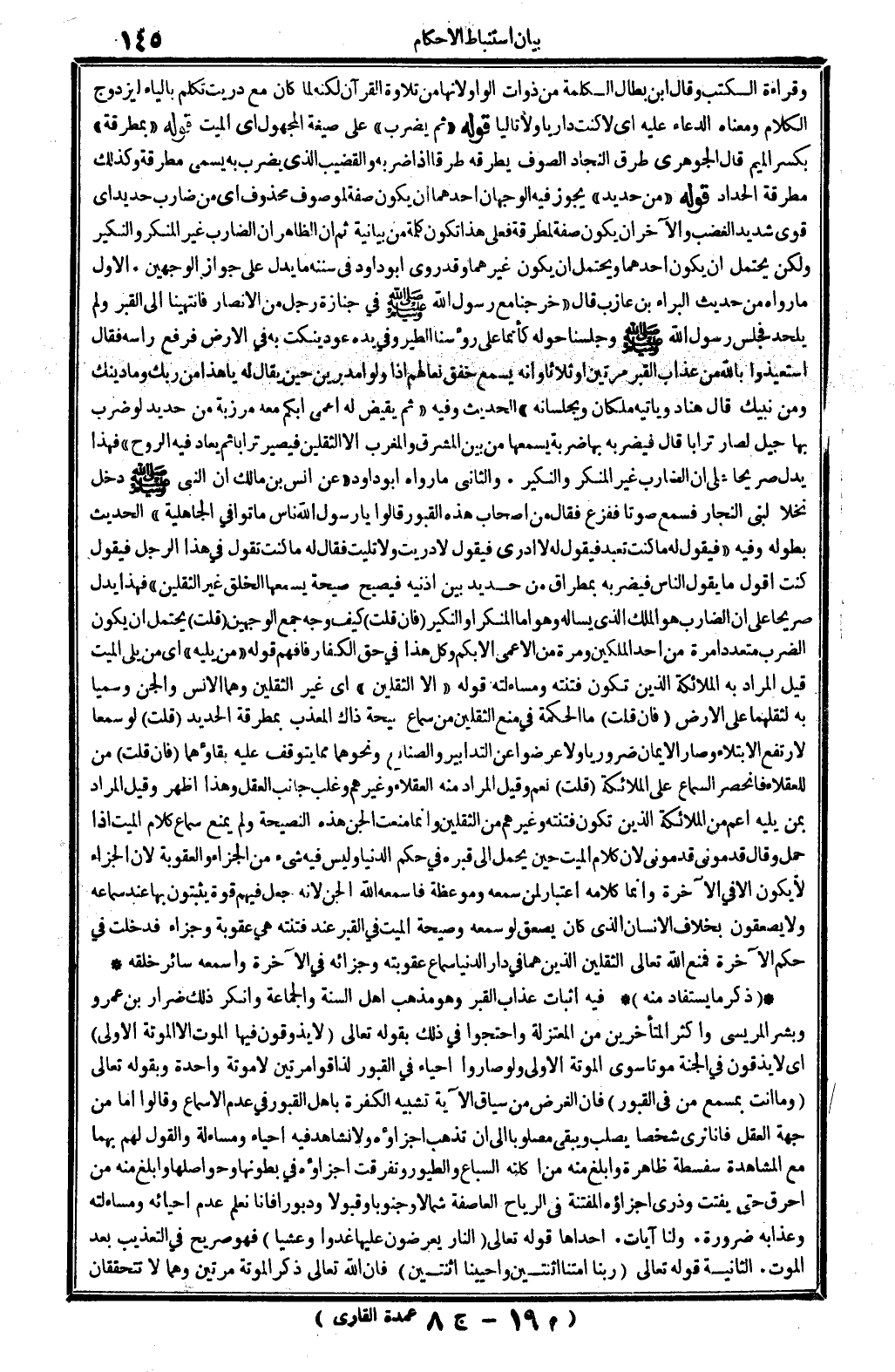 ذكر مَا يُسْتَفَاد مِنْهُ: فِيهِ: إِثْبَات عَذَاب الْقَبْر، وَهُوَ مَذْهَب أهل السّنة وَالْجَمَاعَة، وَأنكر ذَلِك ضرار بن عَمْرو وَبشر المريسي وَأكْثر الْمُتَأَخِّرين من الْمُعْتَزلَة، وَاحْتَجُّوا فِي ذَلِك بقوله تَعَالَى: {لَا يذوقون فِيهَا الْمَوْت إِلَّا الموتة الأولى} (الدُّخان: 65) . أَي: لَا يذوقون فِي الْجنَّة موتا سوى الموتة الأولى، وَلَو صَارُوا أَحيَاء فِي الْقُبُور لذاقوا مرَّتَيْنِ لَا موتَة وَاحِدَة، وَبِقَوْلِهِ تَعَالَى: {وَمَا أَنْت بمسمع من فِي الْقُبُور} (فاطر: 22) . فَإِن الْغَرَض من سِيَاق الْآيَة تَشْبِيه الْكَفَرَة بِأَهْل الْقُبُور فِي عدم الإسماع. وَقَالُوا: أما من جِهَة الْعقل فَأَنا نرى شخصا يصلب وَيبقى مصلوبا إِلَى أَن تذْهب أجزاؤه وَلَا نشاهد فِيهِ أَحيَاء ومساءلة، وَالْقَوْل لَهُم بهما مَعَ الْمُشَاهدَة سفسطة ظَاهِرَة، وأبلغ مِنْهُ من أَكلته السبَاع والطيور وَتَفَرَّقَتْ أجزاؤه فِي بطونها وحواصلها، وأبلغ مِنْهُ من أحرق حَتَّى يفتت وذري أجزاؤه المفتتة فِي الرِّيَاح الْعَاصِفَة شمالاً وجنوبا وقبولاً ودبورا، فَإنَّا نعلم عدم إحيائه ومساءلته وعذابه ضَرُورَة. وَلنَا آيَات: إِحْدَاهَا: قَوْله تَعَالَى: {النَّار يعرضون عَلَيْهَا غدوا وعشيا} (غَافِر: 64) . فَهُوَ صَرِيح فِي التعذيب بعد الْمَوْت. الثَّانِيَة: قَوْله تَعَالَى: {رَبنَا أمتنَا اثْنَتَيْنِ وأحيينا اثْنَتَيْنِ} (غَافِر: 11) . فَإِن الله تَعَالَى ذكر الموتة مرَّتَيْنِ، وهما لَا تتحققان