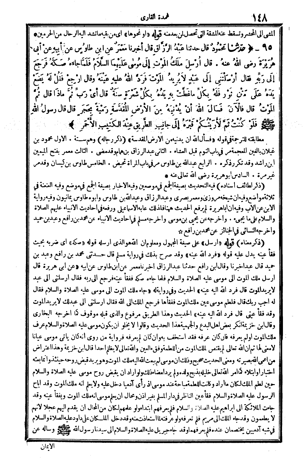 9331 - حدَّثنا مَحْمُودٌ قَالَ حَدثنَا عَبْدُ الرَّزَّاقِ قَالَ أخبرنَا مَعْمَرٌ عنِ ابنِ طاوُسٍ عَن أبِيهِ عنْ أبي هُرَيْرَةَ رَضِي الله تَعَالَى عنهُ. قَالَ أُرْسِلَ مَلَكُ المَوْتِ إلَى مُوسى عَلَيْهِما السلاَمُ فَلَمَّا جاءَهُ صَكَّهُ فَرَجَعَ إلَى رَبِّهِ فَقَالَ أرْسَلْتَنِي إلَى عبْدٍ لاَ يُرِيدُ الْمَوتَ فَرَدَّ الله عَلَيْهِ عَيْنَهُ وَقَالَ ارْجِعْ فَقُلْ لَهُ يَضَعْ يَدَهُ عَلَى مَتْنِ ثَوْر فَلَهُ بِكُلِّ مَا غَطَّتْ بِهِ يَدُهُ بِكُلِّ شَعْرَةٍ سَنَةٌ قَالَ أيْ رَبِّ ثُمَّ ماذَا قَالَ ثُمَّ المَوْتُ قَالَ فاْلآنَ فَسَالَ الله أنْ يُدْنِيهِ مِنَ الأرْضِ المُقَدَّسَةِ رَمْيَةً بِحَجَرٍ قَالَ قَالَ رسولُ الله صلى الله عَلَيْهِ وَسلم فَلَوْ كُنْتُ ثَمَّ لأَرَيْتُكُمْ قَبْرَهُ إلَى جانِبِ الطَّرِيقِ عِنْدَ الكَثِيبِ الأَحْمَرِ.