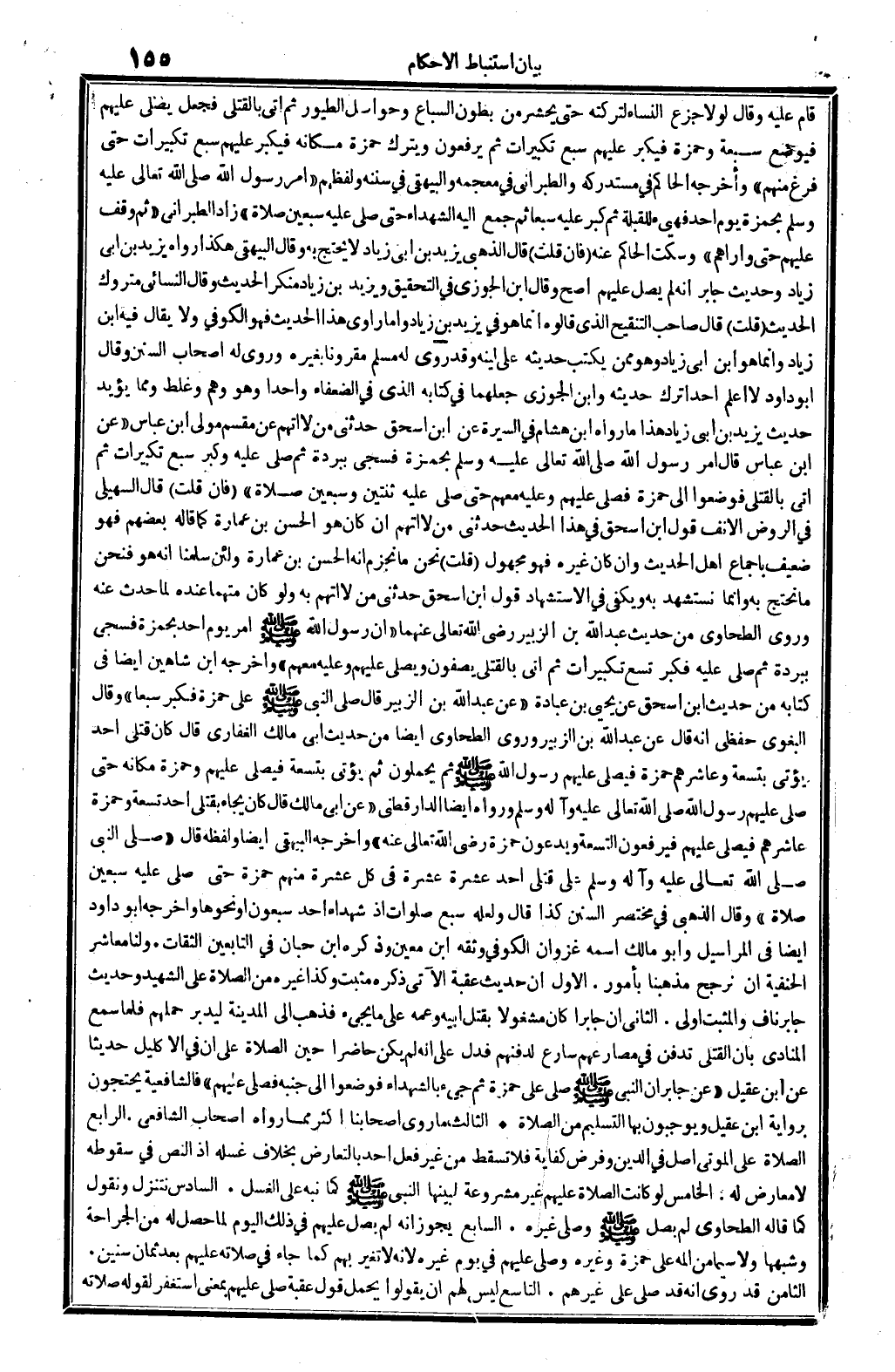 وَلنَا معاشر الْحَنَفِيَّة أَن نرجح مَذْهَبنَا بِأُمُور. الأول: أَن حَدِيث عقبَة الْآتِي ذكره مُثبت وَكَذَا غَيره من الصَّلَاة على الشَّهِيد، وَحَدِيث جَابر نافٍ والمثبت أولى. الثَّانِي: أَن جَابِرا كَانَ مَشْغُولًا بقتل أَبِيه وَعَمه، على مَا يَجِيء، فَذهب إِلَى الْمَدِينَة ليدبر حملهمْ، فَلَمَّا سمع الْمُنَادِي بِأَن الْقَتْلَى تدفن فِي مصَارِعهمْ سارع لدفنهم، فَدلَّ على أَنه لم يكن حَاضرا حِين الصَّلَاة، على أَن فِي (الإكليل) : حَدِيثا عَن ابْن عقيل (عَن جَابر أَن النَّبِي صلى الله عَلَيْهِ وَسلم صلى على حَمْزَة، ثمَّ جِيءَ بِالشُّهَدَاءِ فوضعوا إِلَى جنبه فصلى عَلَيْهِم) . فالشافعية يحتجون بِرِوَايَة ابْن عقيل ويوجبون بهَا التَّسْلِيم من الصَّلَاة. الثَّالِث: مَا روى أَصْحَابنَا أَكثر مِمَّا رَوَاهُ أَصْحَاب الشَّافِعِي. الرَّابِع: الصَّلَاة على الْمَوْتَى أصل فِي الدّين وَفرض كِفَايَة فَلَا تسْقط من غير فعل أحد بالتعارض، بِخِلَاف غسله، إِذْ النَّص فِي سُقُوطه لَا معَارض لَهُ. الْخَامِس: لَو كَانَت الصَّلَاة عَلَيْهِم غير مَشْرُوعَة لبينها النَّبِي صلى الله عَلَيْهِ وَسلم كَمَا نبه على الْغسْل. السَّادِس: نَتَنَزَّل ونقول كَمَا قَالَه الطَّحَاوِيّ: لم يصلِّ صلى الله عَلَيْهِ وَسلم وَصلى غَيره. السَّابِع: يجوز أَنه: لم يصل عَلَيْهِم فِي ذَلِك الْيَوْم، لما حصل لَهُ من الْجراحَة وَشبههَا، وَلَا سِيمَا من ألمه على حَمْزَة وَغَيره، وَصلى عَلَيْهِم فِي يَوْم غَيره لِأَنَّهُ لَا تغير بهم كَمَا جَاءَ فِي صلَاته عَلَيْهِم بعد ثَمَان سِنِين. الثَّامِن: قد رُوِيَ أَنه قد صلى على غَيرهم. التَّاسِع: لَيْسَ لَهُم أَن يَقُولُوا: يحمل قَول عقبَة: صلى عَلَيْهِم، بِمَعْنى اسْتغْفر، لقَوْله: صلَاته