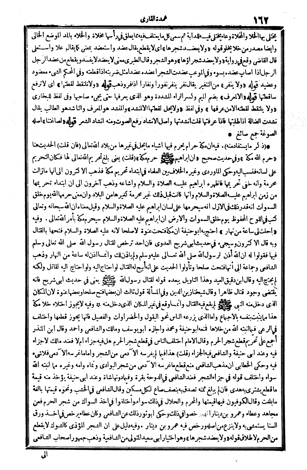 وَفِيه: لَا يجوز اختلاء خلا مَكَّة هَذَا مِمَّا ينْبت بِنَفسِهِ بِالْإِجْمَاع. وَأما الَّذِي يزرعه النَّاس نَحْو الْبُقُول والخضراوات، والفصيل فَإِنَّهَا يجوز قطعهَا. وَاخْتلف فِي الرَّعْي فِيمَا أَنْبَتَهُ الله من خَلاهَا، فَمَنعه أَبُو حنيفَة وَمُحَمّد وَأَجَازَهُ أَبُو يُوسُف وَمَالك وَالشَّافِعِيّ وَأحمد. وَقَالَ ابْن الْمُنْذر: أجمع على تَحْرِيم قطع شجر الْحرم، وَقَالَ الإِمَام: اخْتلف النَّاس فِي قطع شجر الْحرم: هَل فِيهِ جَزَاء أم لَا؟ فَعِنْدَ مَالك: لَا جَزَاء فِيهِ، وَعند أبي حنيفَة وَالشَّافِعِيّ: فِيهِ الْجَزَاء. قلت: هَذَا فِيمَا لم يغرسه الْآدَمِيّ من الشّجر. وَأما مَا غرسه الْآدَمِيّ فَلَا شَيْء فِيهِ، وخكى الْخطابِيّ أَن مَذْهَب الشَّافِعِي منع قطع مَا غرسه الْآدَمِيّ من شجر الْبَوَادِي ونماه وَأمه، وَغَيره مِمَّا أَنْبَتَهُ الله سَوَاء، وَاخْتلف قَوْله فِي جَزَاء الشّجر، فَعِنْدَ الشَّافِعِي: فِي الدوحة بقرة، وَفِيمَا دونهَا شَاة. وَعند أبي حنيفَة: يُؤْخَذ مِنْهُ قيمَة مَا قطع يشترى بِهِ هدى، فَإِن لم يبلغ ثمنه تصدق بِهِ بنضف صَاع لكل مِسْكين. وَقَالَ الشَّافِعِي: فِي الْخشب وَنَحْوه قيمتهَا بَالِغَة مَا بلغت. وَقَالَ الْكُوفِيُّونَ: فِيهَا قيمتهَا، وَالْمحرم والحلال فِي ذَلِك سَوَاء. وَاخْتلفُوا فِي أَخذ السِّوَاك من شجر الْحرم: فَعَن مُجَاهِد وَعَطَاء وَعَمْرو بن دِينَار أَنهم رخصوا فِي ذَلِك، وَحكى أَبُو ثَوْر ذَلِك عَن الشَّافِعِي، وَكَانَ عَطاء يرخص فِي أَخذ ورق السنا يستمشي بِهِ وَلَا ينْزع من أَصله، وَرخّص فِيهِ عَمْرو بن دِينَار.