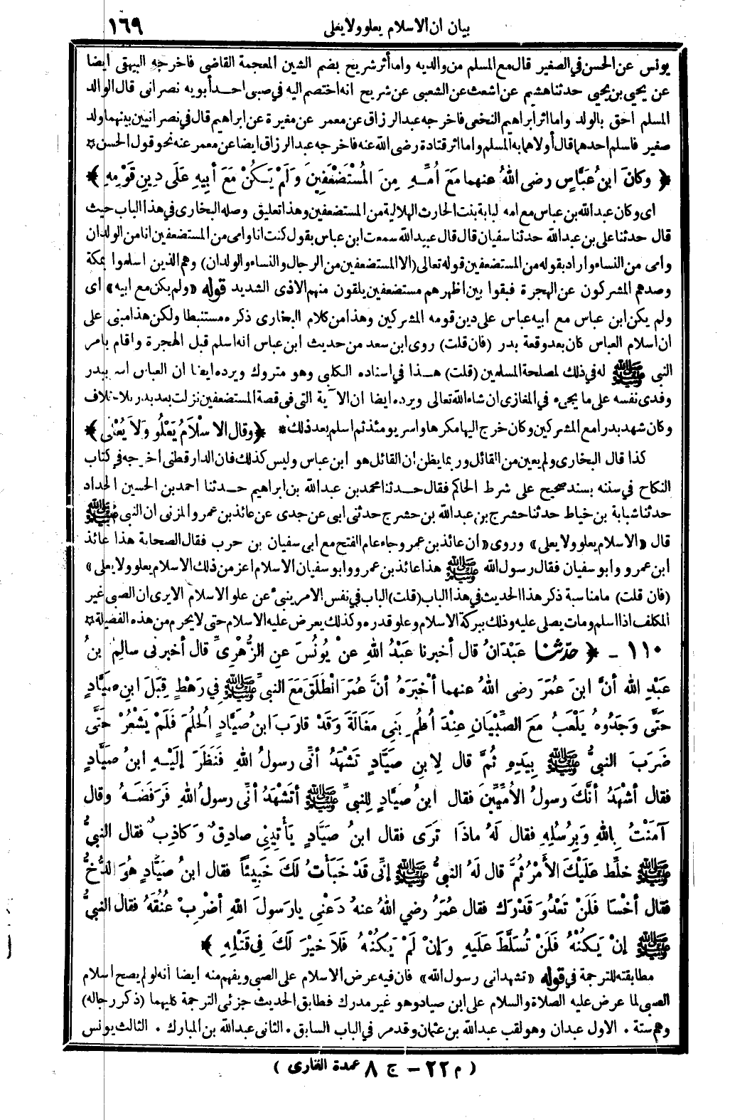 110 - (حَدثنَا عَبْدَانِ قَالَ أخبرنَا عبد الله عَن يُونُس عَن الزُّهْرِيّ قَالَ أَخْبرنِي سَالم بن عبد الله أَن ابْن عمر رَضِي الله عَنْهُمَا أخبرهُ أَن عمر انْطلق مَعَ النَّبِي - صَلَّى اللَّهُ عَلَيْهِ وَسَلَّم َ - فِي رَهْط قبل ابْن صياد حَتَّى وجدوه يلْعَب مَعَ الصّبيان عِنْد أَطَم بني مغالة وَقد قَارب ابْن صياد الْحلم فَلم يشْعر حَتَّى ضرب النَّبِي - صَلَّى اللَّهُ عَلَيْهِ وَسَلَّم َ - بِيَدِهِ ثمَّ قَالَ لِابْنِ صياد تشهد أَنِّي رَسُول الله فَنظر إِلَيْهِ ابْن صياد فَقَالَ أشهد أَنَّك رَسُول الْأُمِّيين فَقَالَ ابْن صياد للنَّبِي - صَلَّى اللَّهُ عَلَيْهِ وَسَلَّم َ - أَتَشهد أَنِّي رَسُول الله فرفضه وَقَالَ آمَنت بِاللَّه وبرسله فَقَالَ لَهُ مَاذَا ترى فَقَالَ ابْن صياد يأتيني صَادِق وكاذب فَقَالَ النَّبِي - صَلَّى اللَّهُ عَلَيْهِ وَسَلَّم َ - خلط عَلَيْك الْأَمر ثمَّ قَالَ لَهُ النَّبِي - صَلَّى اللَّهُ عَلَيْهِ وَسَلَّم َ - إِنِّي قد خبأت لَك خبيئا فَقَالَ ابْن صياد هُوَ الدخ فَقَالَ أخسا فَلَنْ تعدو قدرك فَقَالَ عمر رَضِي الله عَنهُ دَعْنِي يَا رَسُول الله أضْرب عُنُقه فَقَالَ النَّبِي - صَلَّى اللَّهُ عَلَيْهِ وَسَلَّم َ - إِن يكنه فَلَنْ تسلط عَلَيْهِ وَإِن لم يكنه فَلَا خير لَك فِي قَتله) مطابقته للتَّرْجَمَة فِي قَوْله " تشهد أَنِّي رَسُول الله " فَإِن فِيهِ عرض الْإِسْلَام على الصَّبِي وَيفهم مِنْهُ أَيْضا أَنه لَو لم يَصح إِسْلَام الصَّبِي لما عرض عَلَيْهِ الصَّلَاة وَالسَّلَام على ابْن صياد وَهُوَ غير مدرك فطابق الحَدِيث جزئي التَّرْجَمَة كليهمَا. (ذكر رِجَاله) وهم سِتَّة. الأول عَبْدَانِ وَهُوَ لقب عبد الله بن عُثْمَان وَقد مر فِي الْبَاب السَّابِق. الثَّانِي عبد الله بن الْمُبَارك. الثَّالِث يُونُس