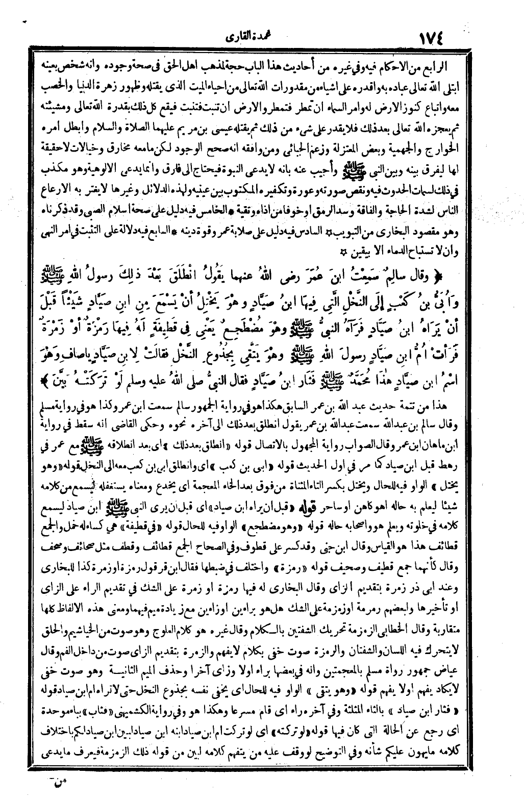 هَذَا من تَتِمَّة حَدِيث عبد الله بن عمر السَّابِق، هَكَذَا هُوَ فِي رِوَايَة الْجُمْهُور: سَالم سَمِعت ابْن عَمْرو كَذَا هُوَ فِي رِوَايَة مُسلم. وَقَالَ سَالم بن عبد الله: سَمِعت عبد الله بن عمر يَقُول: انْطلق بعد ذَلِك ... إِلَى آخِره نَحوه، وَحكى القَاضِي أَنه سقط فِي رِوَايَة ابْن ماهان: ابْن عمر، وَقَالَ: الصَّوَاب رِوَايَة الْمَجْهُول بالاتصال. قَوْله: (انْطلق بعد ذَلِك) أَي: بعد انطلاقه صلى الله عَلَيْهِ وَسلم مَعَ عمر فِي رَهْط قبل ابْن صياد، كَمَا مر فِي أول الحَدِيث. قَوْله: (أبي بن كَعْب) أَي: وَانْطَلق أبي بن كَعْب مَعَه إِلَى النّخل. قَوْله: (وَهُوَ يخْتل) الْوَاو: فِيهِ للْحَال، و: يخْتل، بِكَسْر التَّاء الْمُثَنَّاة من فَوق بعد الْخَاء الْمُعْجَمَة: أَي يخدع، وَمَعْنَاهُ: يستغفله ليسمع من كَلَامه شَيْئا ليعلم بِهِ حَاله أهوَ كَاهِن أَو سَاحر. قَوْله: (قبل أَن يرَاهُ ابْن صياد) ، أَي: قبل أَن يرى النَّبِي صلى الله عَلَيْهِ وَسلم ابْن صياد ليسمع كَلَامه فِي خلوته وَيعلم هُوَ وَأَصْحَابه حَاله. قَوْله: (وَهُوَ مُضْطَجع) : الْوَاو، فِيهِ للْحَال. قَوْله: (فِي قطيفة) هِيَ: كسَاء لَهُ خمل، وَالْجمع قطائف، هَذَا هُوَ الْقيَاس، وَقَالَ ابْن جني: وَقد كسر على قطوف، وَفِي (الصِّحَاح) : الْجمع قطائف وقطف، مثل: صَحَائِف وصحف. وَقَالَ: كَأَنَّهُمَا جمع قطيف وصحيف. قَوْله: (رمزة) وَاخْتلف فِي ضَبطهَا، فَقَالَ ابْن قرقول: (رمزة أَو زمرة) كَذَا للْبُخَارِيّ. وَعند أبي ذَر: زمرة، بِتَقْدِيم الزَّاي، وَقَالَ البُخَارِيّ لَهُ فِيهَا: رمزة أَو زمرة، على الشَّك فِي تَقْدِيم الرَّاء على الزَّاي أَو تَأْخِيرهَا، ولبعضهم: رمرمة أَو زمزمة، على الشَّك: هَل هُوَ براءين أَو زاءين؟ مَعَ زِيَادَة: مِيم، فيهمَا. وَمعنى هَذِه الْأَلْفَاظ كلهَا مُتَقَارِبَة. وَقَالَ الْخطابِيّ: الزمزمة، تَحْرِيك الشفتين بالْكلَام. وَقَالَ غَيره: هُوَ كَلَام العلوج، وَهُوَ صَوت من الخياشيم وَالْحلق لَا يَتَحَرَّك فِيهِ اللِّسَان والشفتان، والرمزة صَوت خَفِي بِكَلَام لَا يفهم، والزمرة بِتَقْدِيم الزَّاي صَوت من دَاخل الْفَم، وَقَالَ عِيَاض: جُمْهُور رُوَاة مُسلم بالمعجمتين، وَأَنه فِي بَعْضهَا برَاء: أَولا وزاي آخرا، وَحذف الْمِيم الثَّانِيَة، وَهُوَ صَوت خَفِي لَا يكَاد يفهم أَو لَا يفهم قَوْله: (وَهُوَ يَتَّقِي) : الْوَاو، فِيهِ للْحَال، أَي: يخفي نَفسه بجذوع النّخل حَتَّى لَا ترَاهُ أم ابْن صياد. قَوْله: (فثار ابْن صياد) ، بالثاء الْمُثَلَّثَة، وَفِي آخِره: رَاء أَي: قَامَ مسرعا، وَهَكَذَا هُوَ، وَفِي رِوَايَة الْكشميهني: (فَثَابَ) بباء مُوَحدَة، أَي: رَجَعَ عَن الْحَالة الَّتِي كَانَ فِيهَا. قَوْله: (لَو تركته) أَي: لَو تركت أم ابْن صياد ابْنه ابْن صياد: لبين ابْن صياد لكم باخْتلَاف كَلَامه مَا يهون عَلَيْكُم شَأْنه، وَفِي (التَّوْضِيح) ، لَو وقف عَلَيْهِ من يتفهم كَلَامه لبين من قَوْله ذَلِك الزمزمة، فَيعرف مَا يَدعِي
