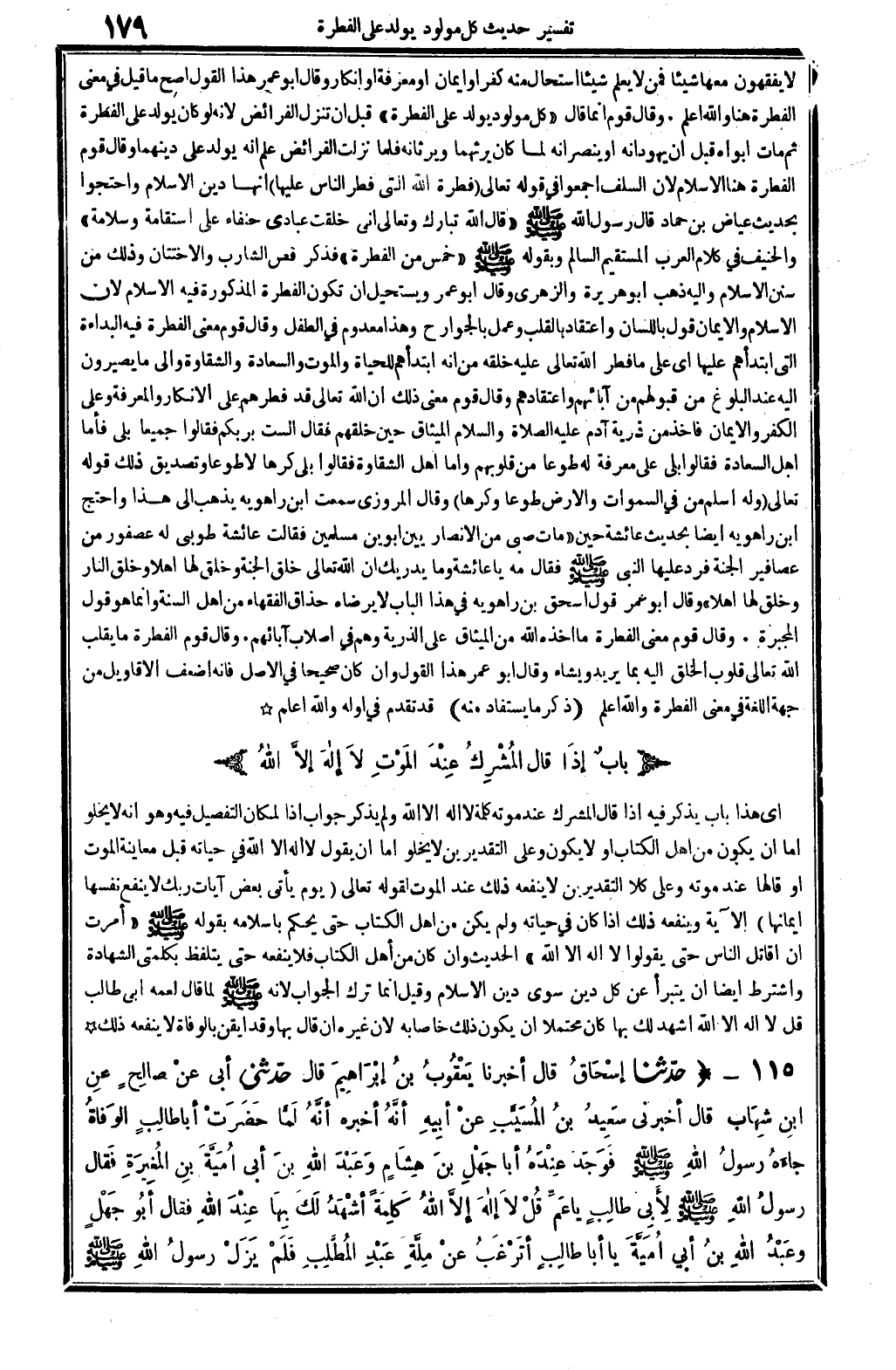 0631 - حدَّثنا إسْحَاقُ قَالَ أخبرنَا يَعْقُوبُ بنُ إبْرَاهِيمَ قَالَ حدَّثني أبي عنْ صالِحٍ عنِ ابنِ شِهَابٍ قَالَ أَخْبرنِي سَعِيدُ بنُ المُسَيَّبِ عنْ أبِيهِ أنَّهُ لَمَّا حَضَرَتْ أَبَا طالِبٍ الوَفَاةُ جاءَهُ رسولُ الله صلى الله عَلَيْهِ وَسلم فَوَجدَ عِنْدَهُ أَبَا جَهْلِ بنِ هِشَامٍ وعَبْدَ الله بنَ أبِي أُمَيَّةَ بنِ المُغِيرَةِ فَقال رسولُ الله صلى الله عَلَيْهِ وَسلم لأِبِي طالبٍ يَا عَمِّ قُلْ لَا إلاه إلاَّ الله كَلِمَةً أشْهَدُ لَكَ بِهَا عِنْدَ الله فَقَالَ أبُو جَهْلٍ وعَبْدُ الله بنُ أبِي أُمَيَّةَ يَا أبَا طَالِبٍ أتَرْغَبُ عَنْ مِلَّةِ عَبْدِ المُطَّلِبِ فَلَمْ يَزَلْ رسولُ الله صلى الله عَلَيْهِ وَسلم